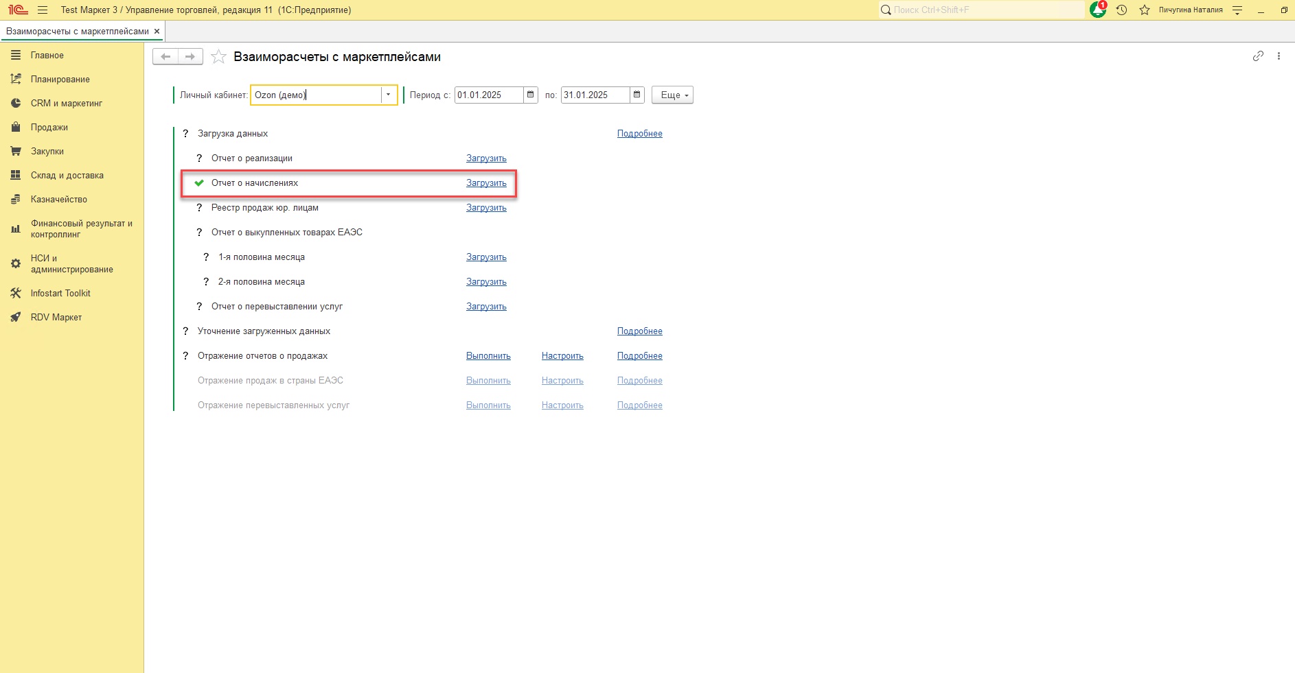 Перейдите по гиперссылке "Загрузить" напротив пункта "Отчет о реализации". Необходимо подождать, пока данные отчёта загрузятся в 1С. Когда процесс загрузки будет завершён, у пункта "Отчет о реализации" появится зелёная галочка.