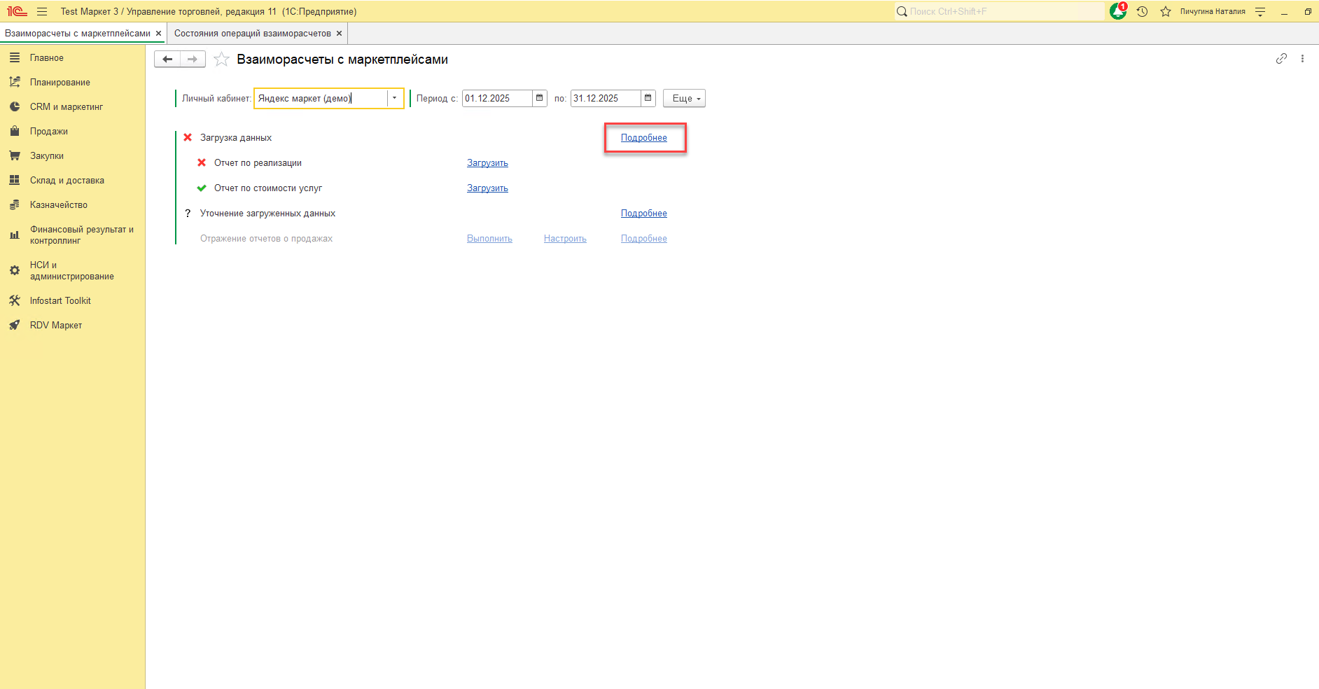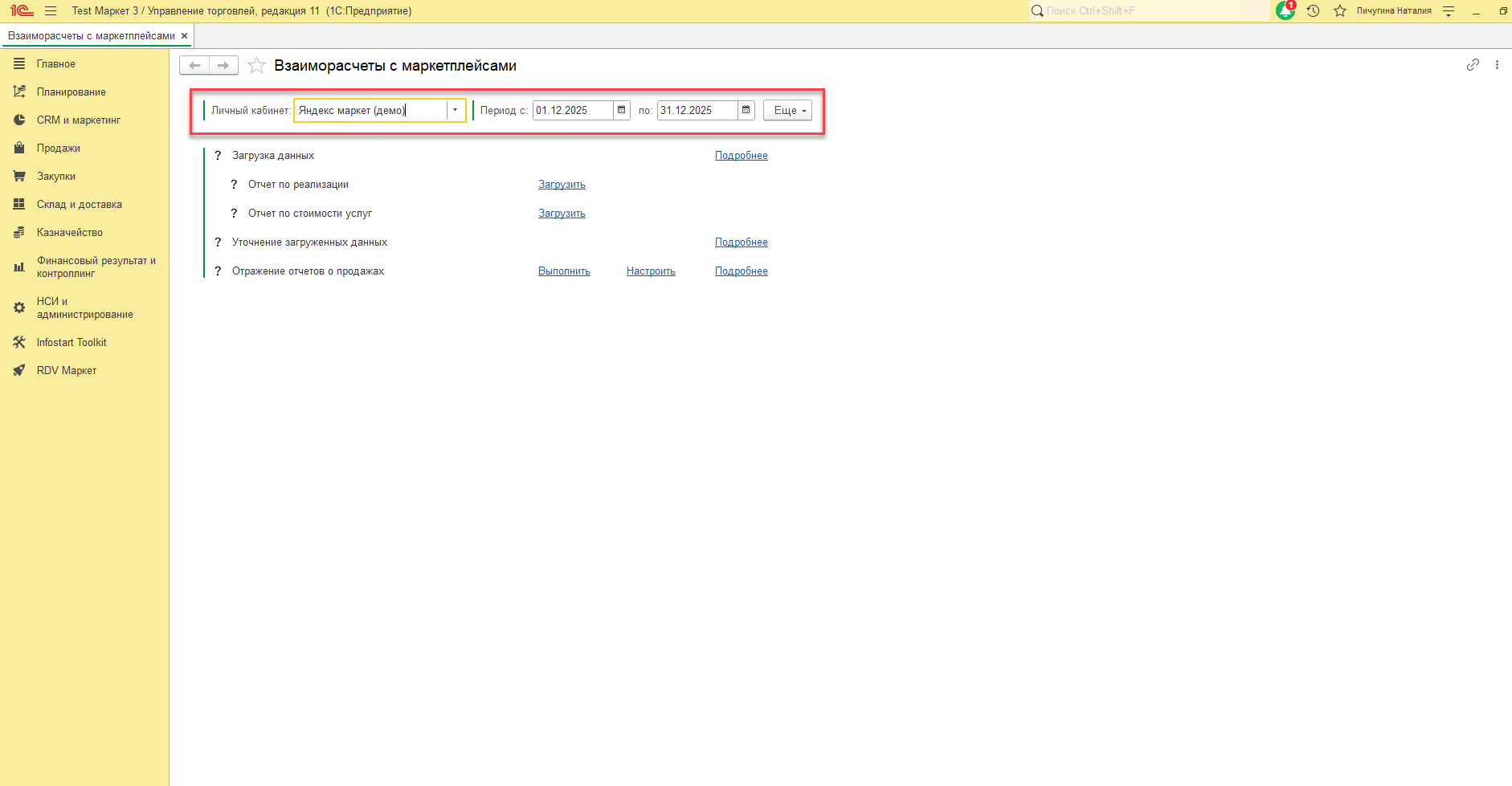 В рабочем месте "Взаиморасчеты с маркетплейсами" выберите личный кабинет и отчетный период загрузки (неделя).