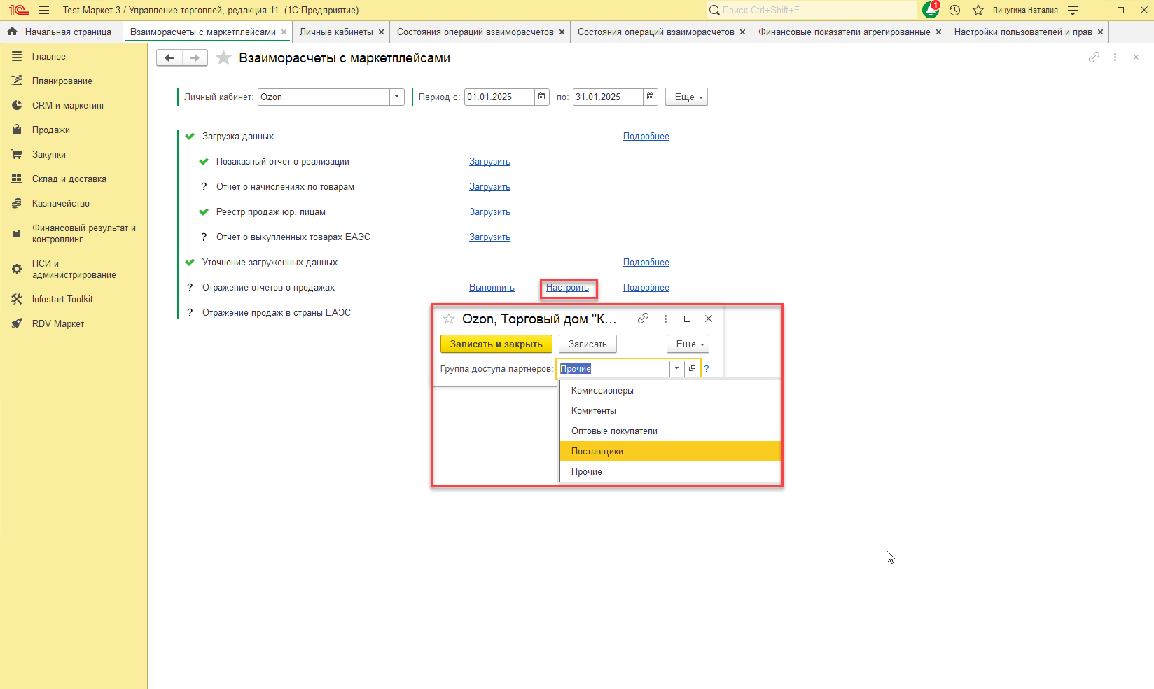 Отчёт о начислениях можно не загружать, он не влияет на формирование документов и нужен только для расчета Unit-экономики. - После того, как все документы будут загружены, нужно проверить, не активна ли в операции "Отражение отчетов о продажах" гиперссылка "Настроить". Она становится активной в том случае, если в вашей 1С включено использование "Групп доступа партнеров". Необходимо заполнить "Группу доступа партнеров" подходящим вам значением.