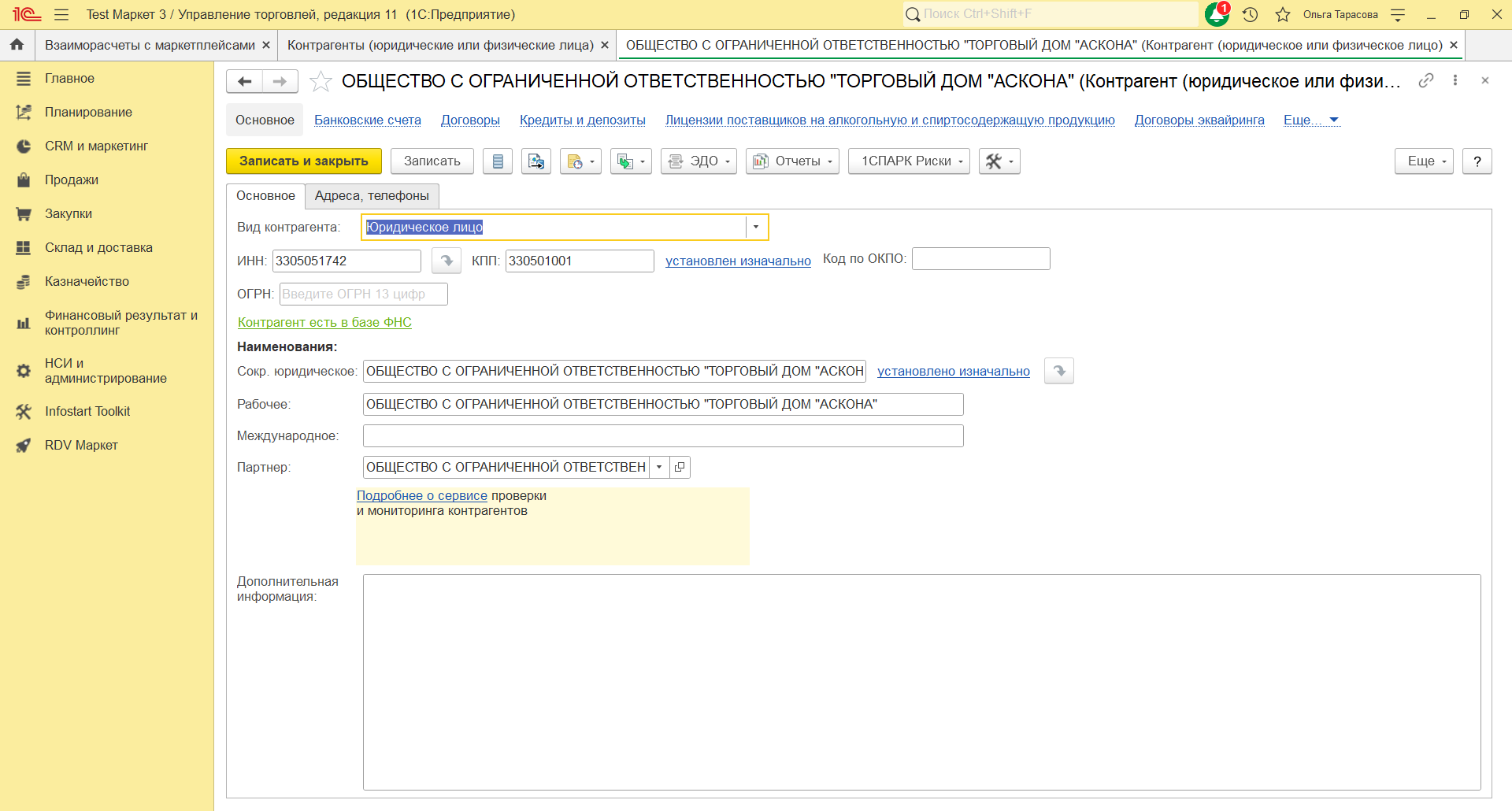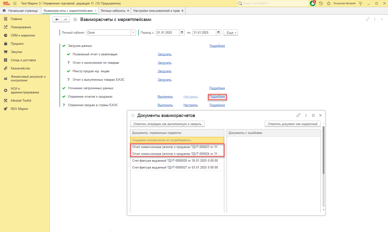 Перед тем как создать нового партнера и контрагента RDV Маркет производит поиск существующих в базе контрагентов по ИНН и КПП, и не будет их дублировать, если ранее они уже были созданы. - В базе 1С будут созданы документы "Отчет комиссионера (агента) о продажах". Один на возвраты (если они были в отчетном периоде), другой на продажи.