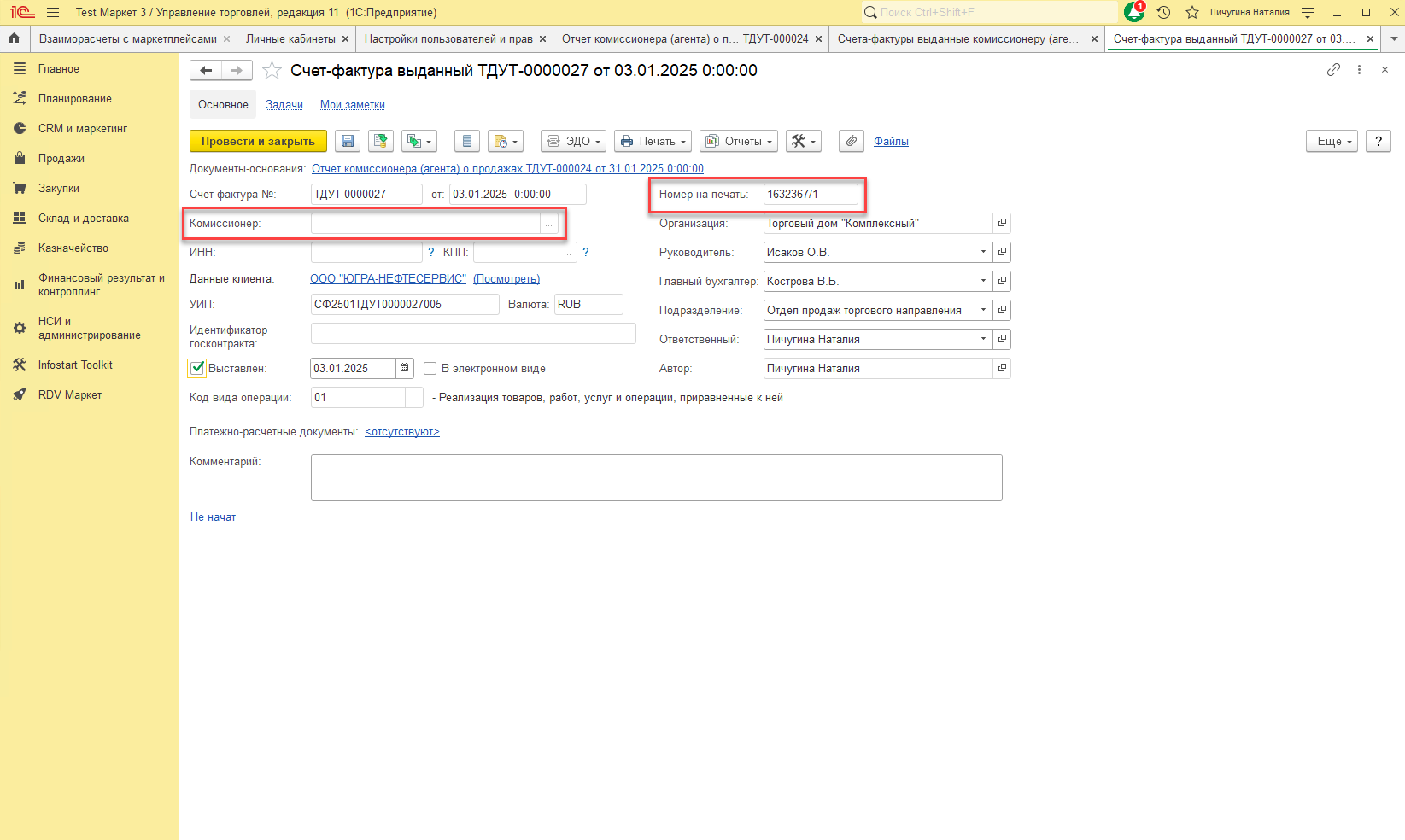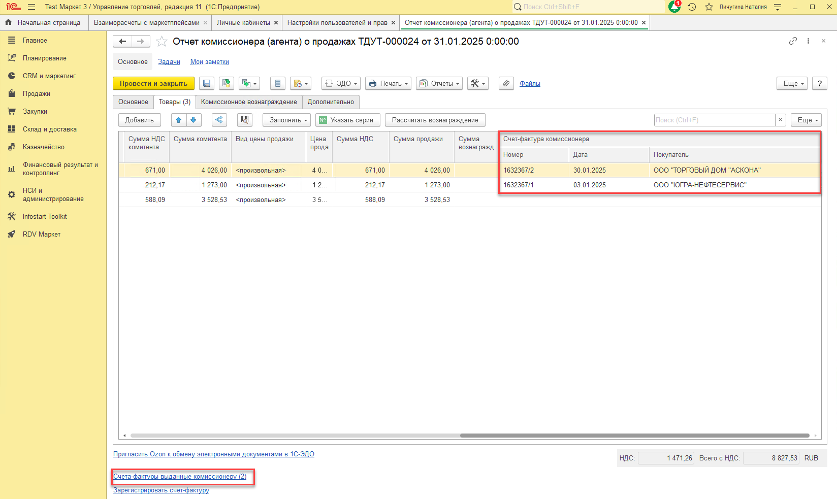 По каждой счет фактуре от маркетплейса будет создан документ "Счет-фактура выданный". Посмотреть все сформированные счета-фактуры можно, перейдя по гиперссылке "Счета-фактуры выданные комиссионеру".