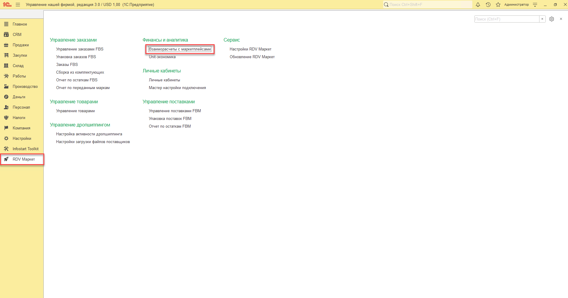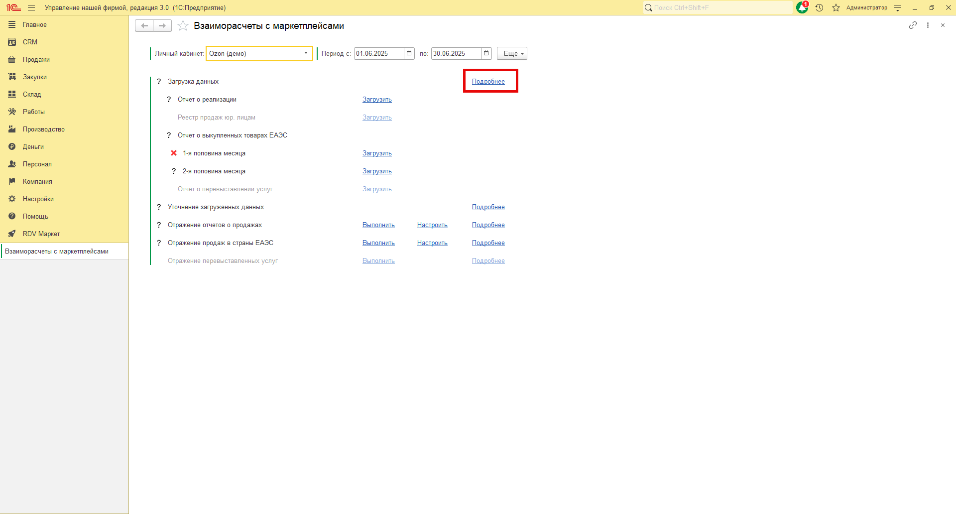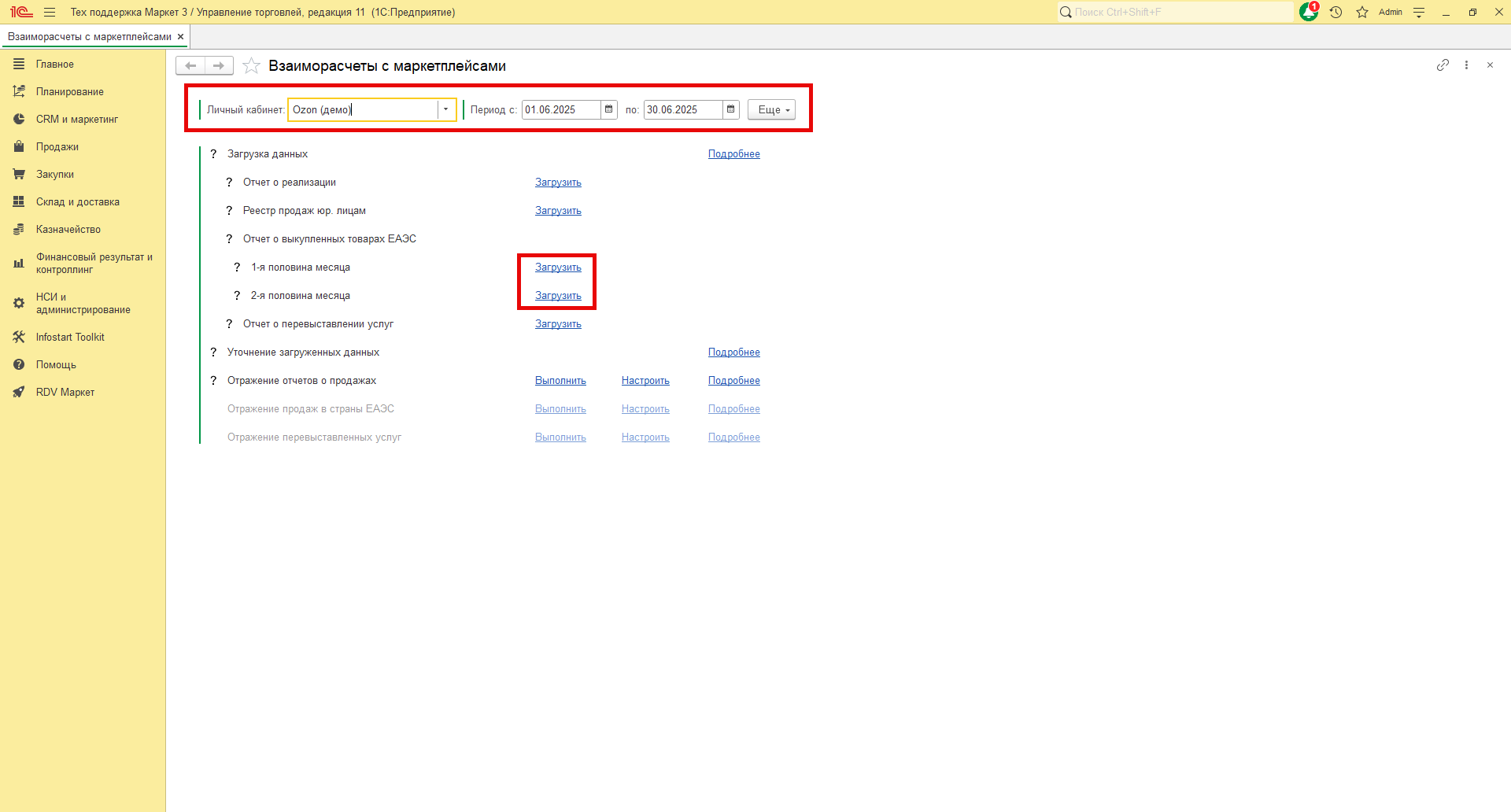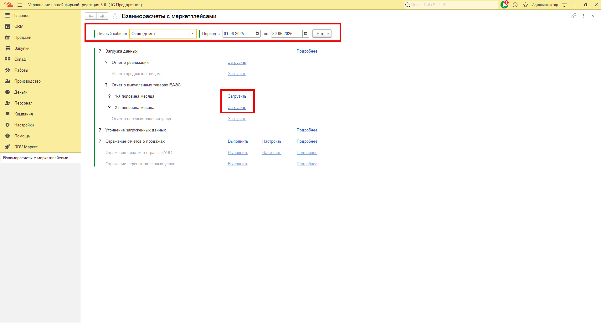 В RDV Маркет загрузка отчета о выкупленных товарах производится по API. Для загрузки отчетов в 1С перейдите в рабочее место "RDV Маркет" - "Взаиморасчёты с маркетплейсами".