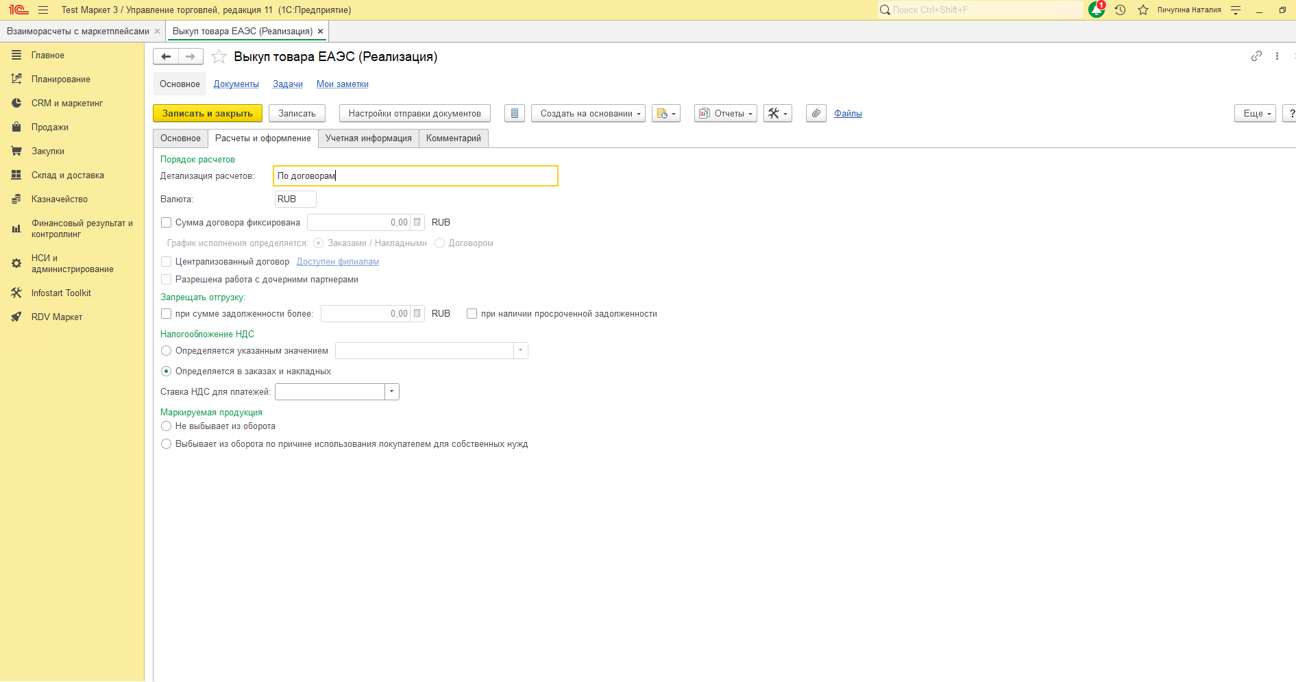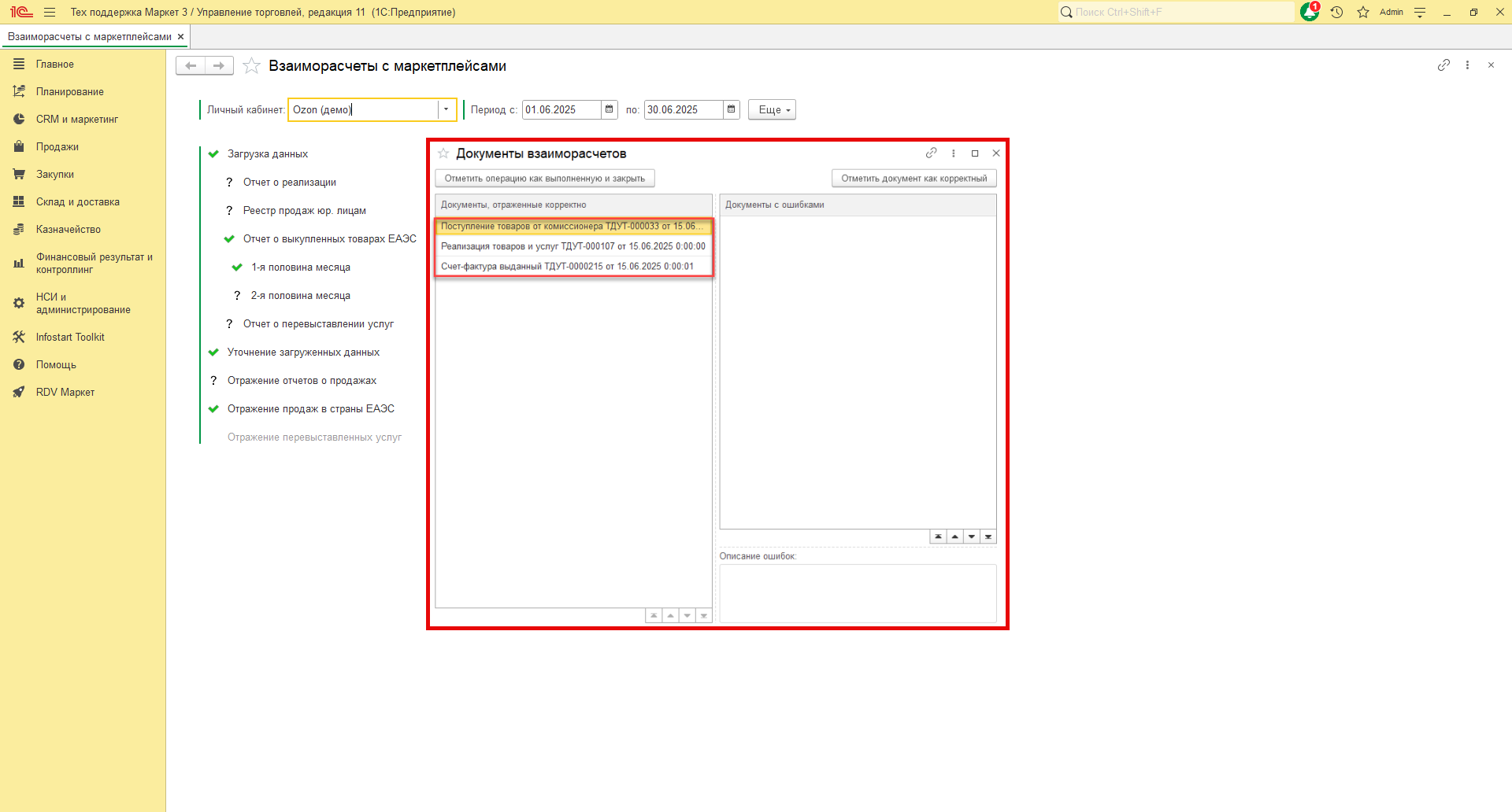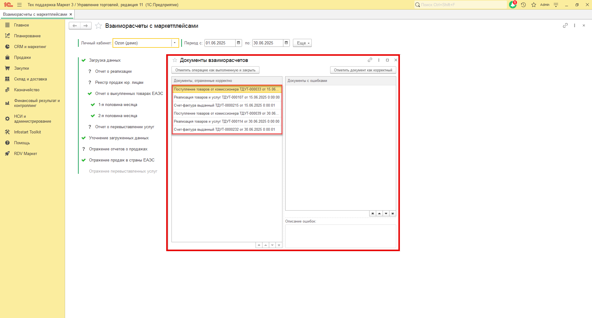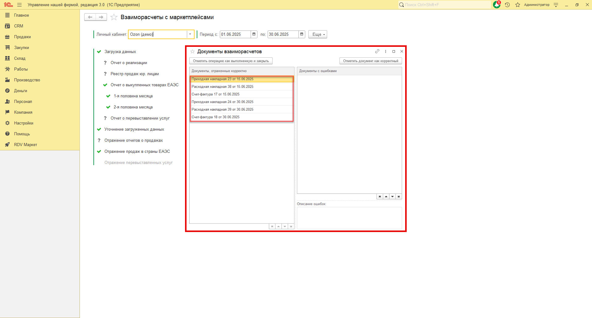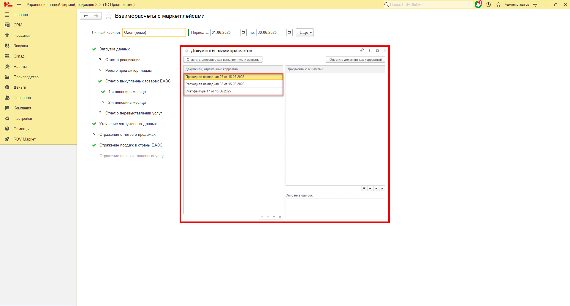 В RDV Маркет загрузка отчета о выкупленных товарах производится по API. Для загрузки отчетов в 1С перейдите в рабочее место "RDV Маркет" - "Взаиморасчёты с маркетплейсами".