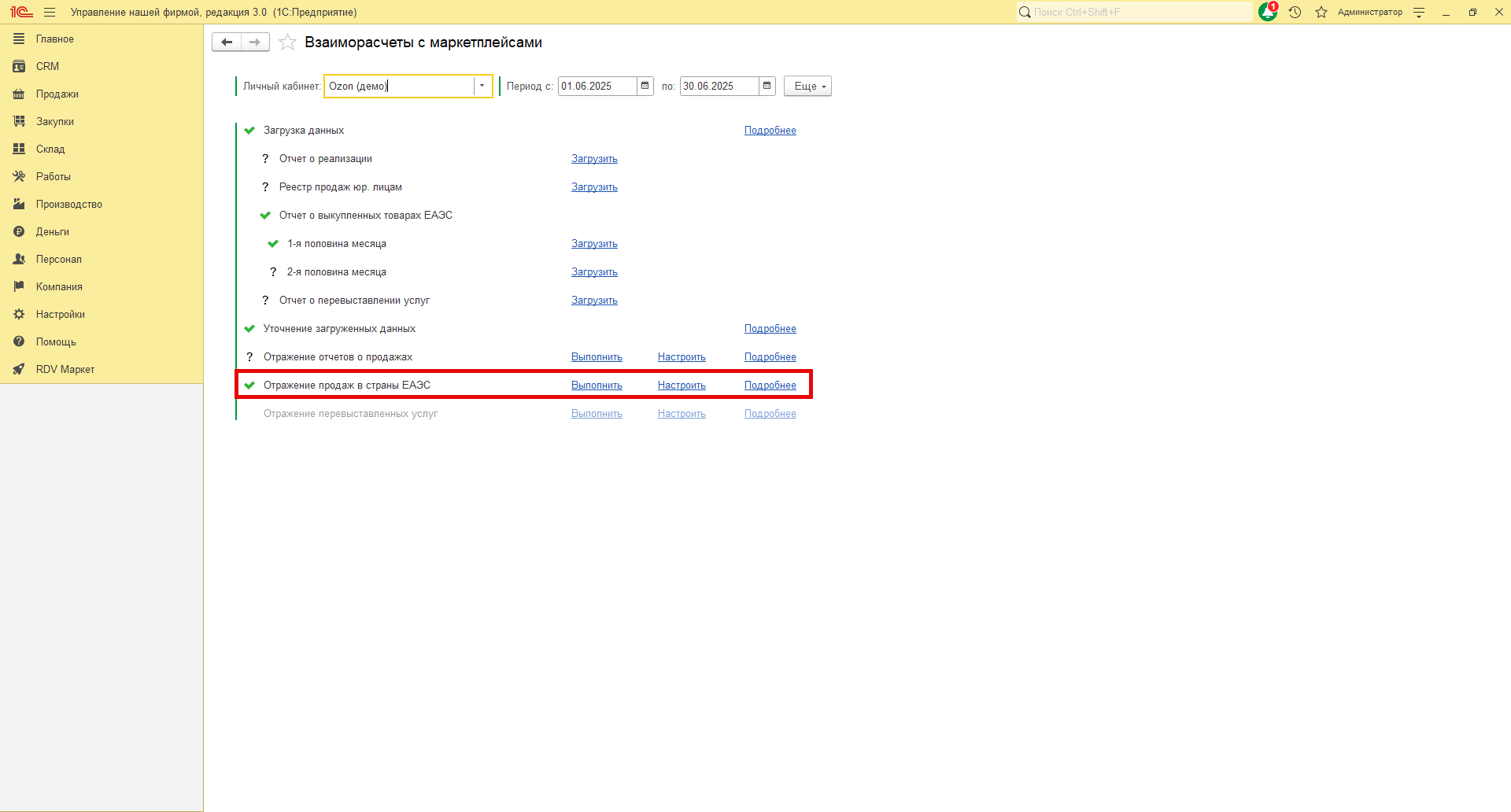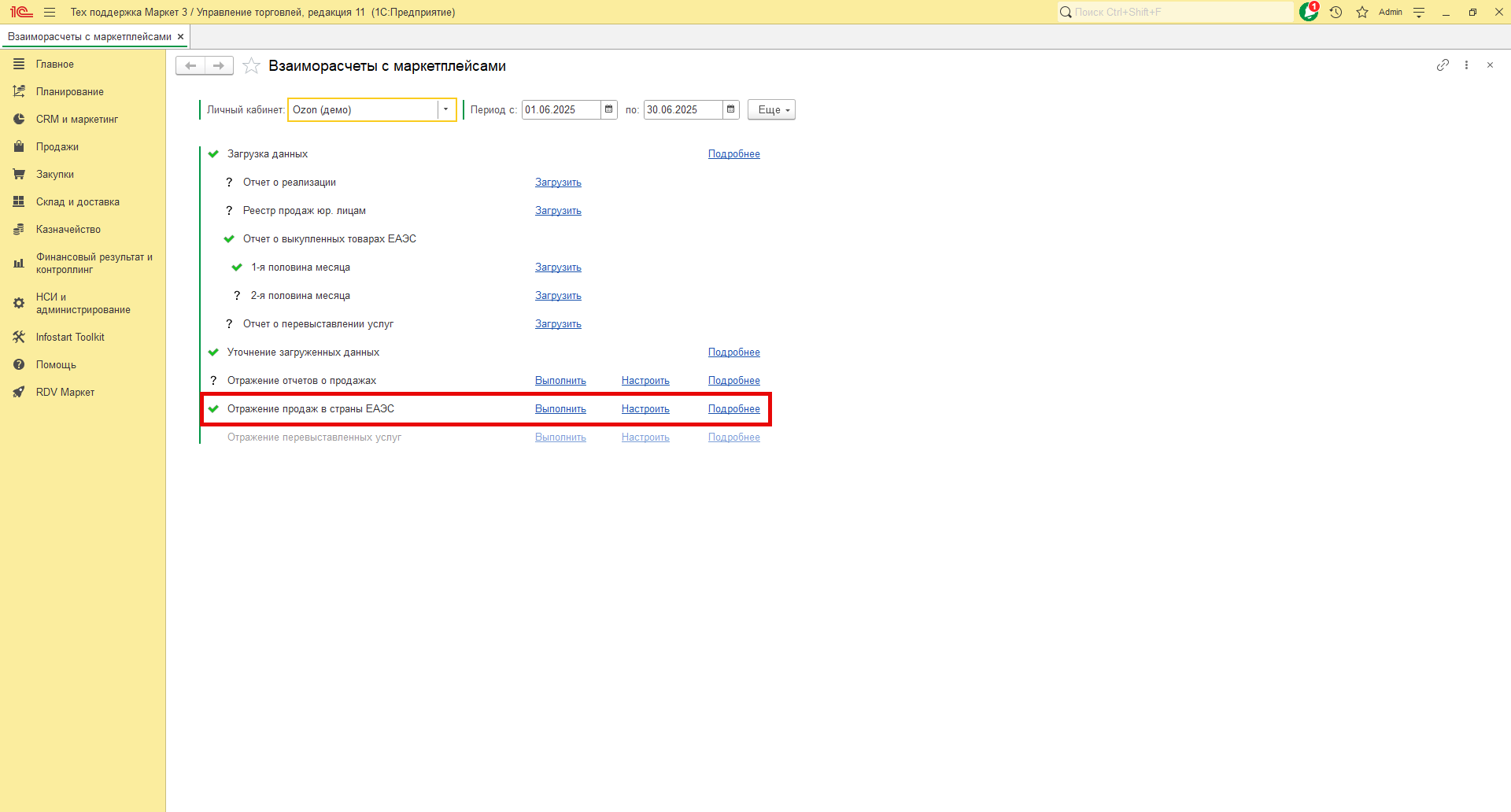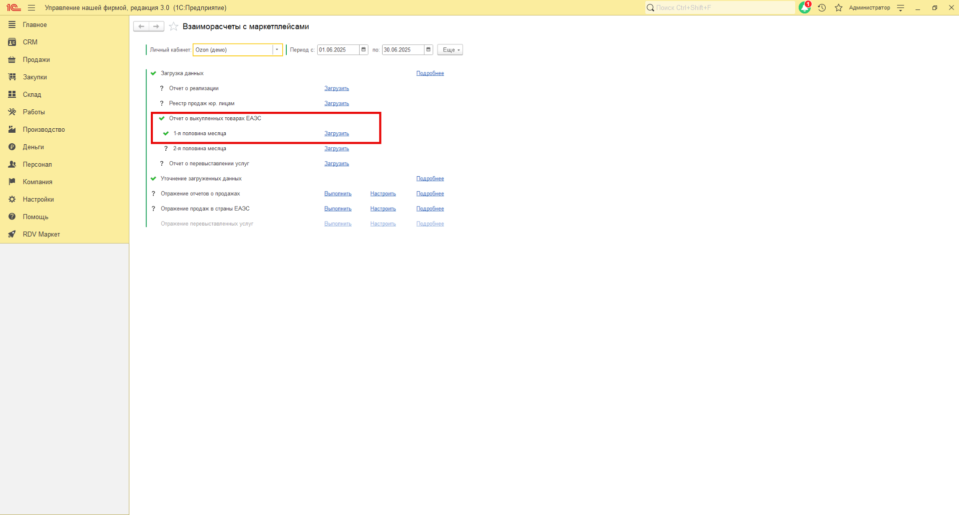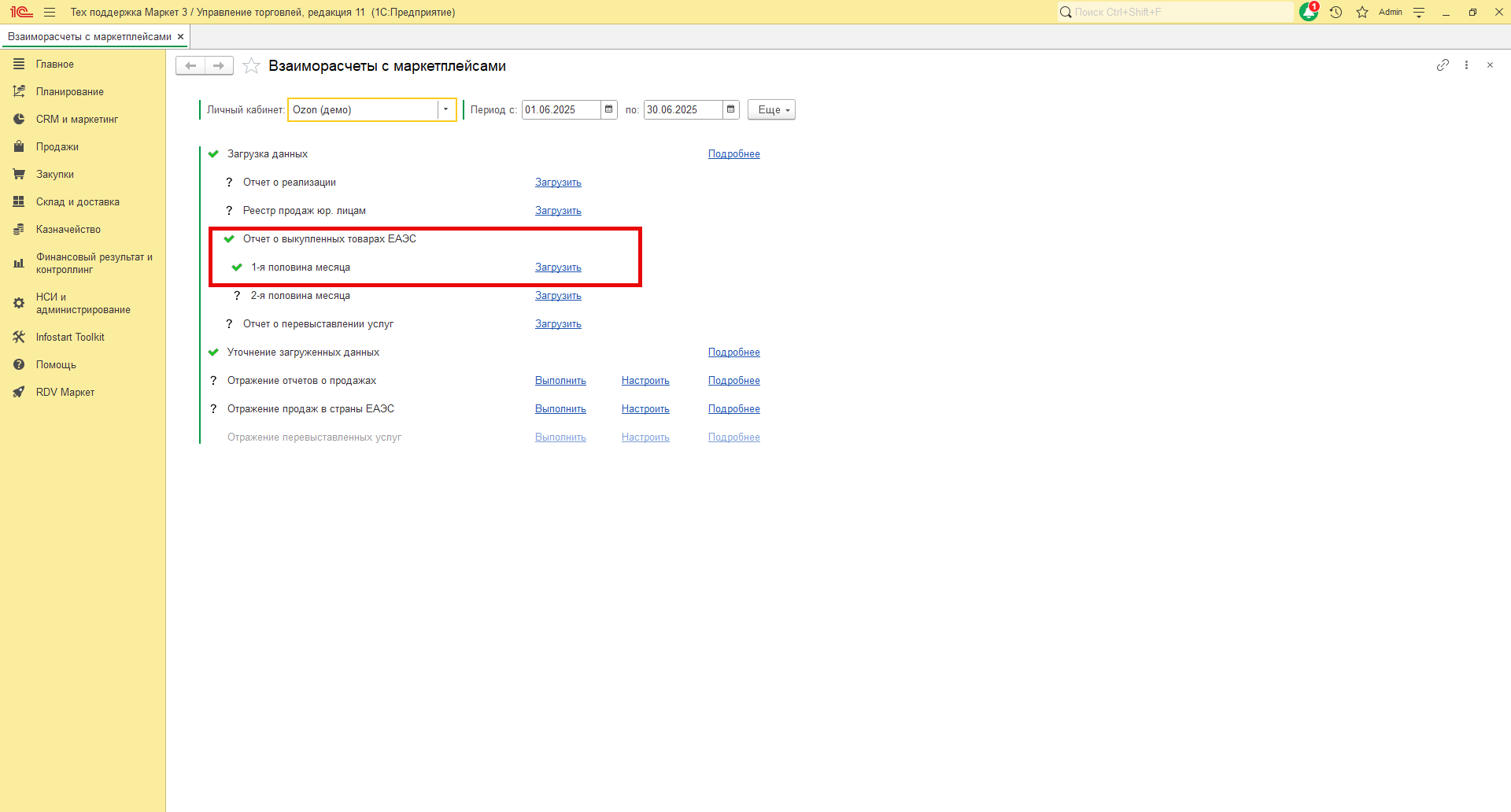 Необходимо подождать, пока данные отчёта загрузятся в 1С. Когда процесс загрузки будет завершён, у пункта "Отчет о выкупленных товарах ЕАЭС 1-я половина месяца" или "Отчет о выкупленных товарах ЕАЭС 2-я половина месяца" в зависимости от того за какую половину месяца вы загружаете отчет, появится зелёная галочка.