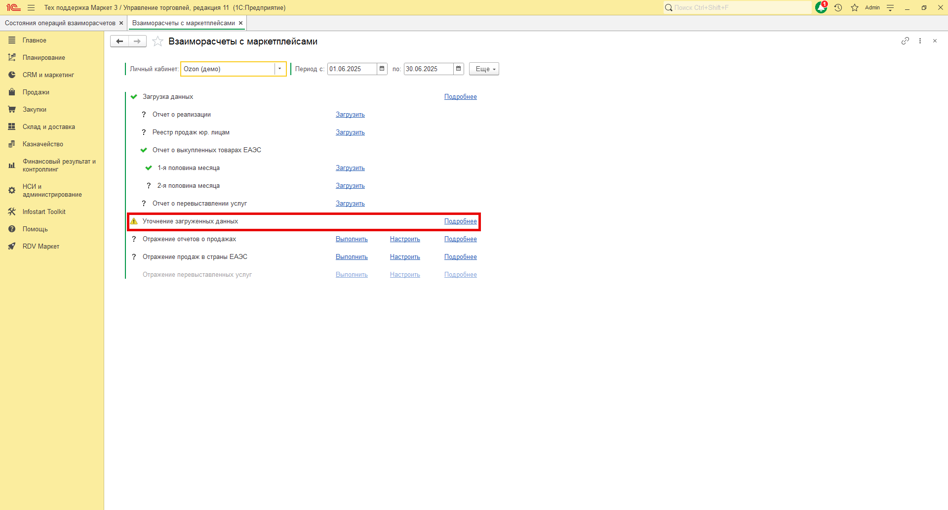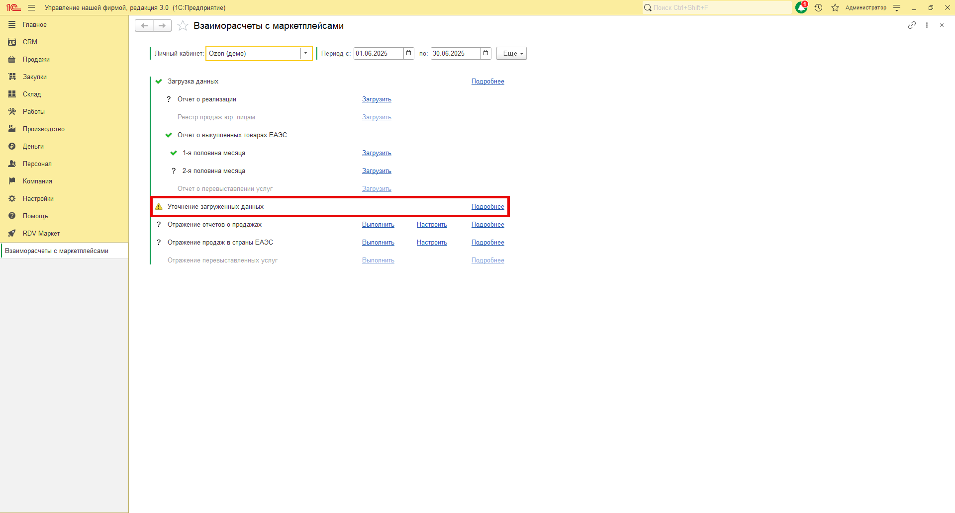 Если после загрузки данных напротив пункта "Уточнение загруженных данных" появляется желтый треугольник с восклицательным знаком, то это означает, что при загрузке данных не все товары отчета были сопоставлены с товарами в RDV Маркет. Перейдите по гиперссылке "Подробнее" для того, чтобы просмотреть список товаров отчета, по которым система не подобрала товар в RDV Маркет.