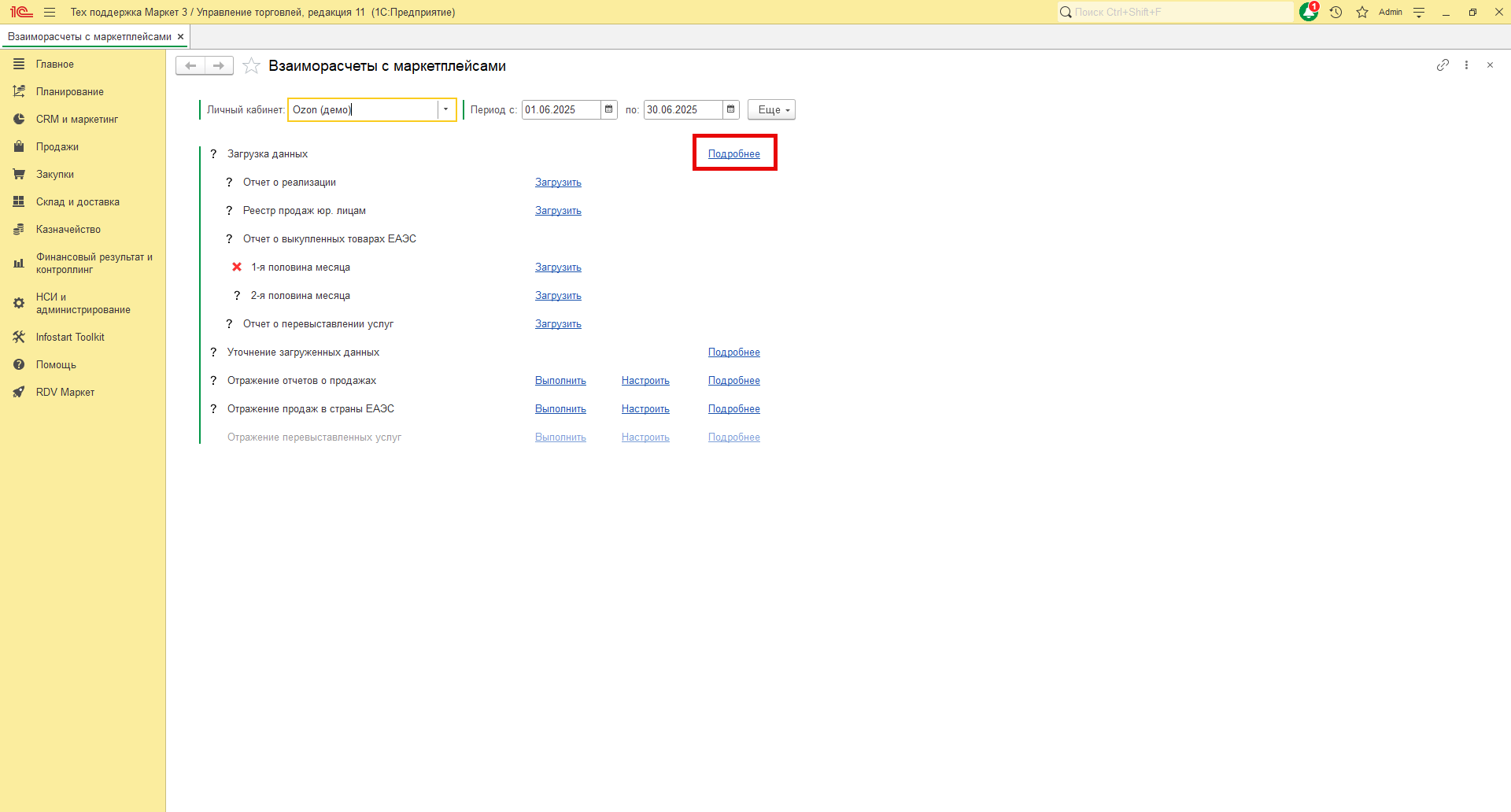 Если при загрузке данных произошла ошибка, то у пункта, при выполнении которого произошла ошибка, будет установлен красный крест. Перейдите по гиперссылке "Подробнее" для получения расширенной информации об ошибке. Если самостоятельно определить и устранить причину ошибки не удалось, создайте обращение на почту поддержки RDV Маркет: support@rdv-it.ru.