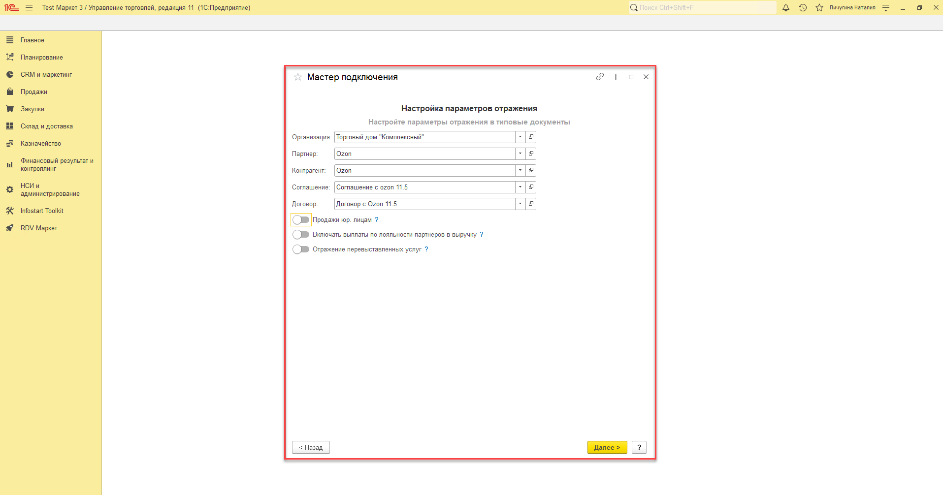 - Договор - договор, по которому будет оформлена продажа товара Ozon, с целью "Реализация".