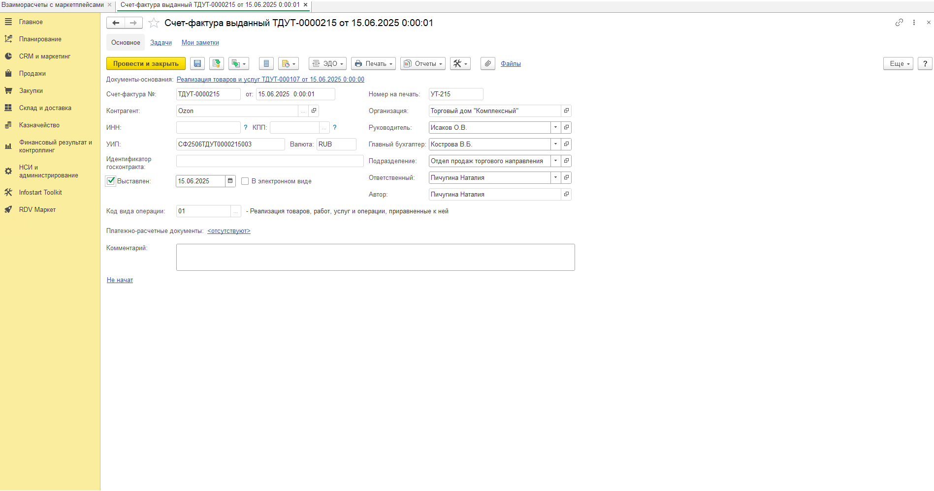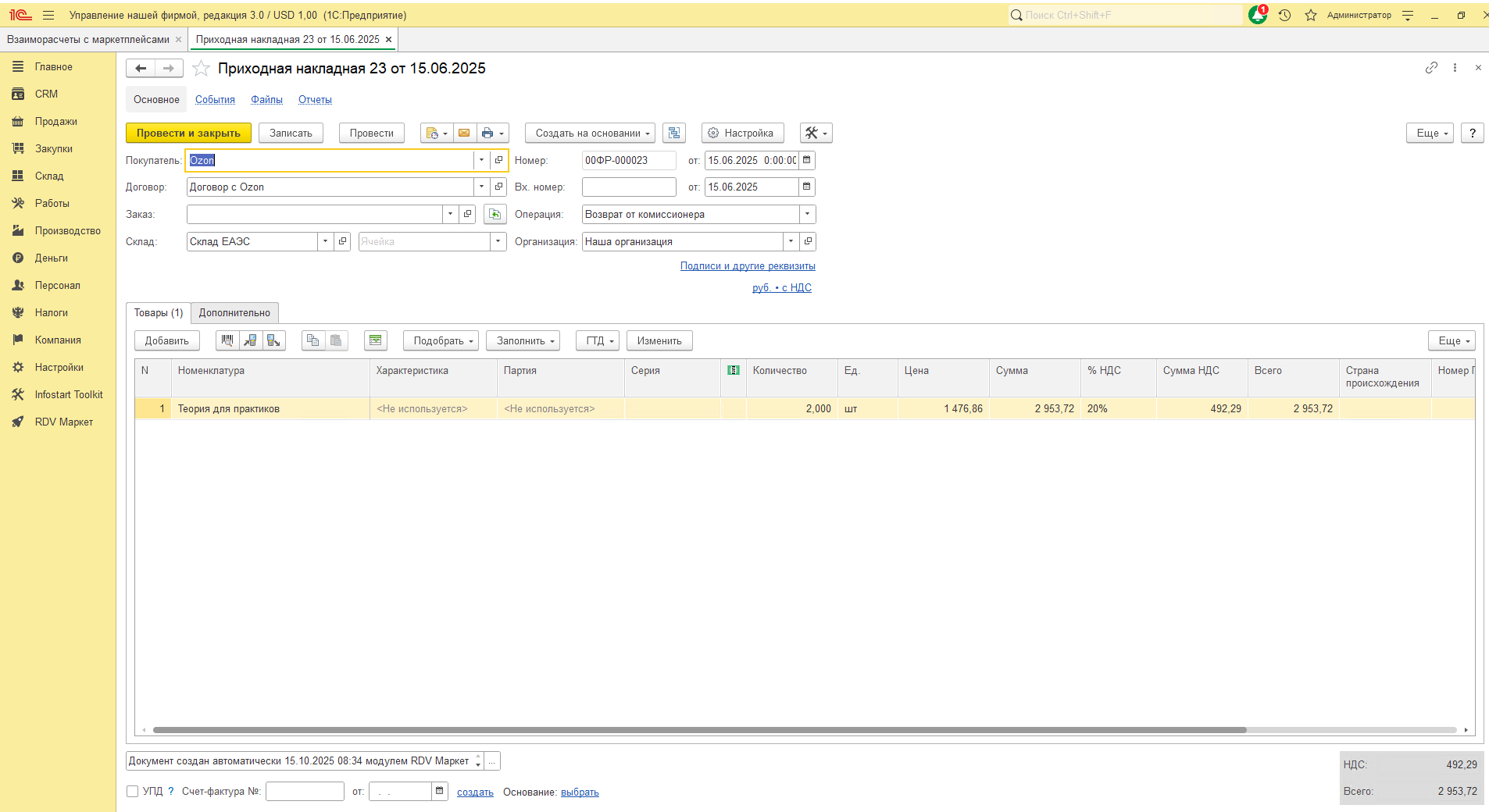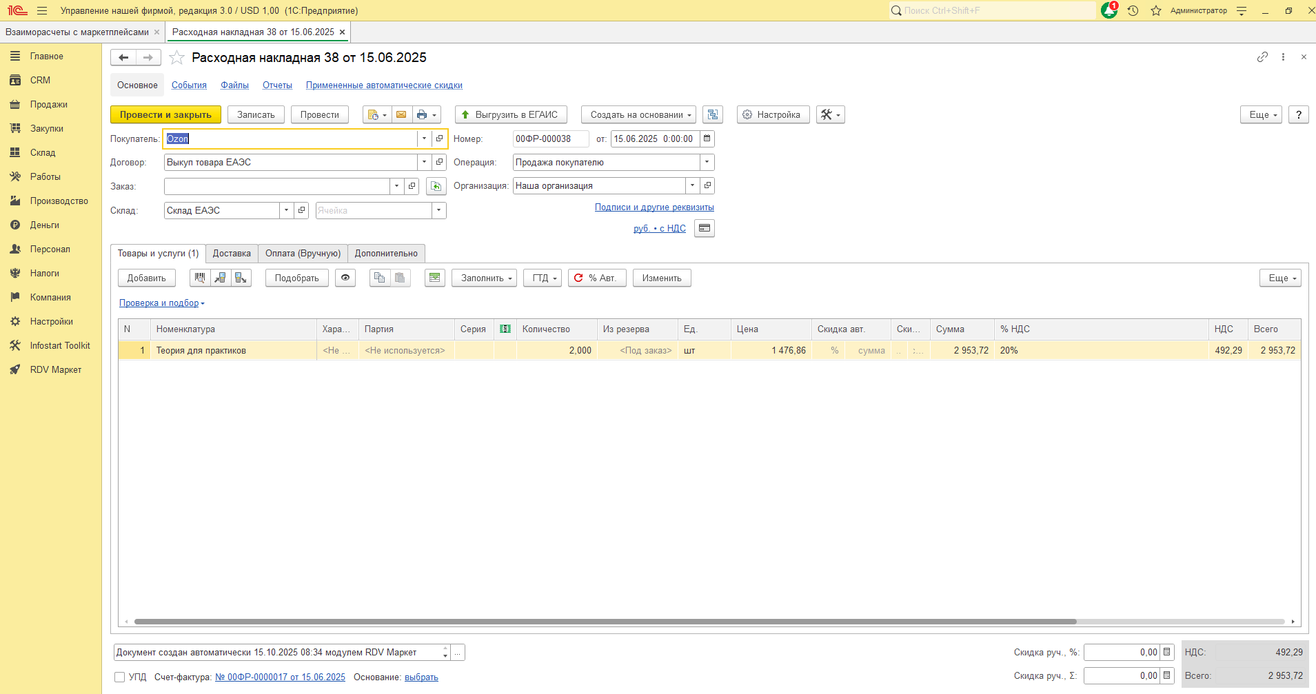 - Расходная накладная с операцией "Продажа покупателю" - продажа товара маркетплейсу.