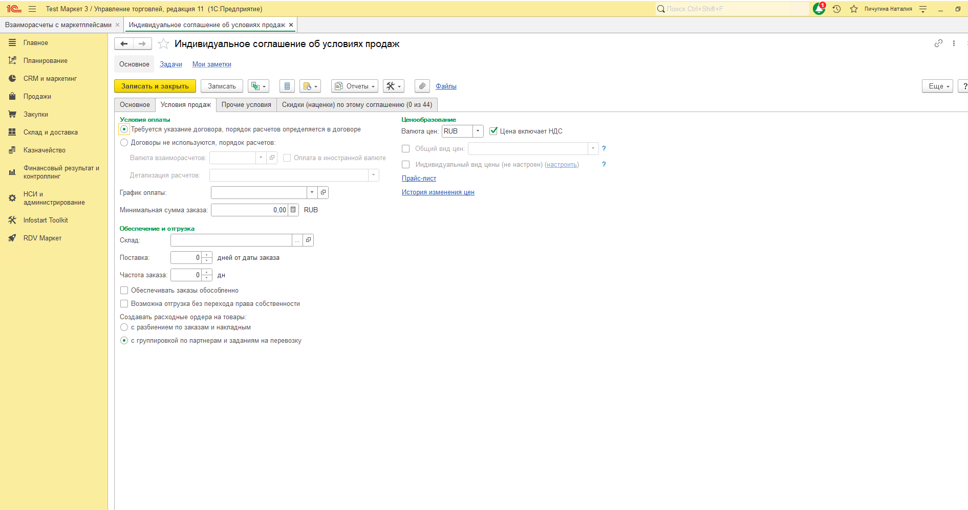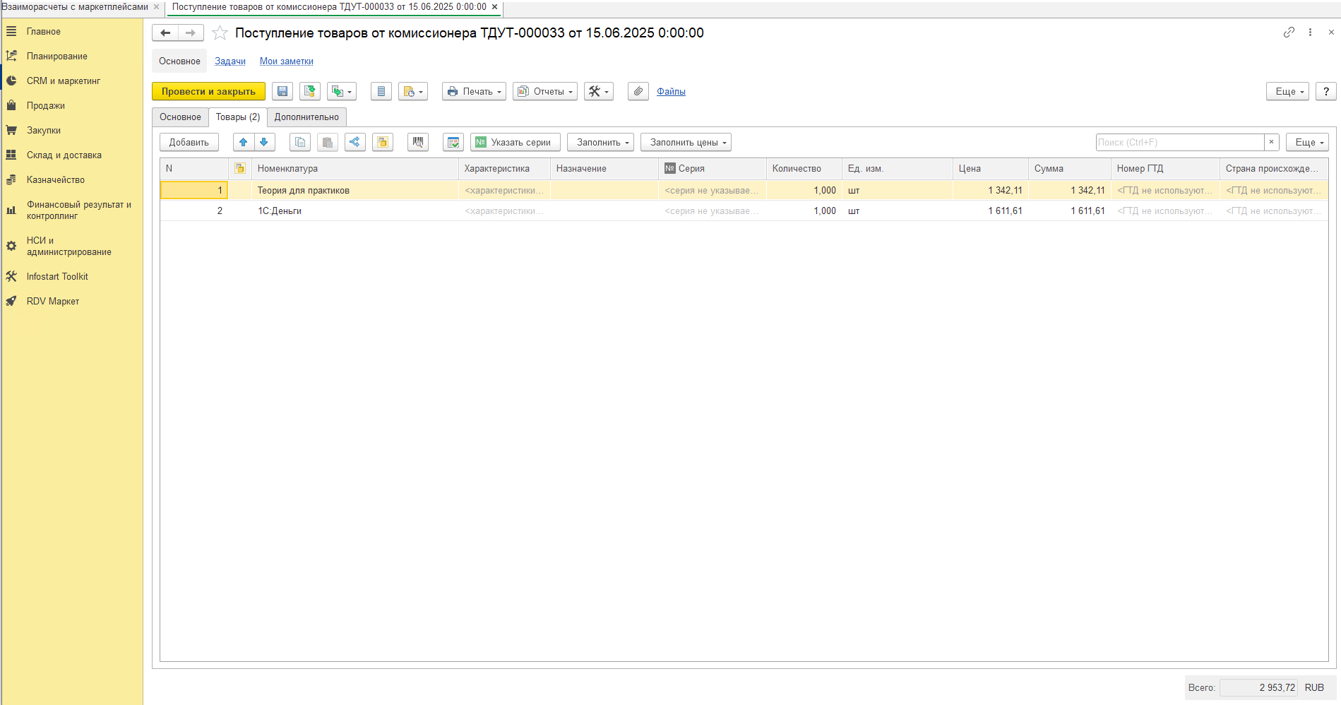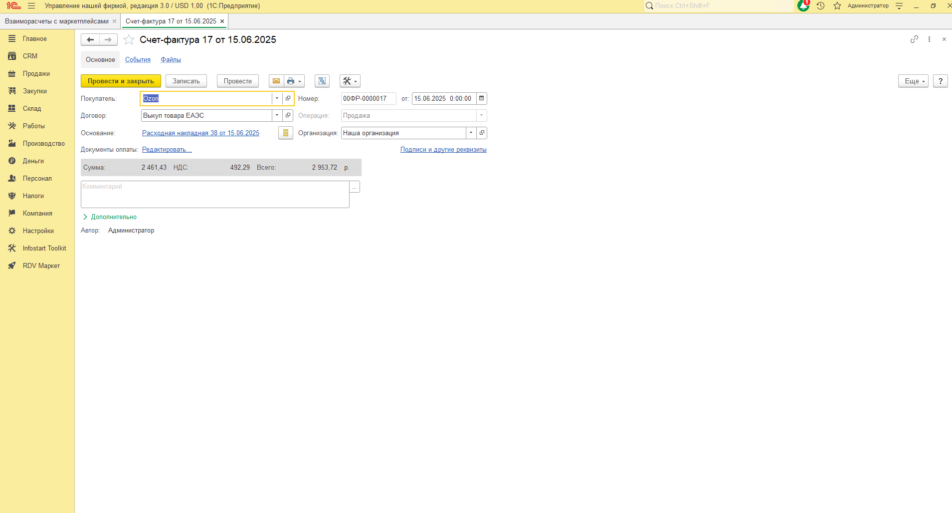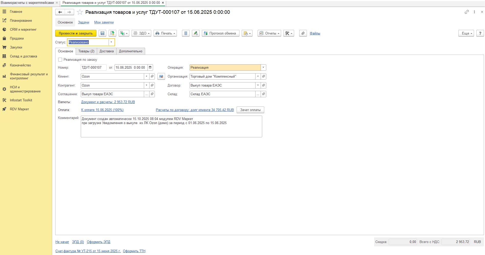 - Расходная накладная с операцией "Продажа покупателю" - продажа товара маркетплейсу.