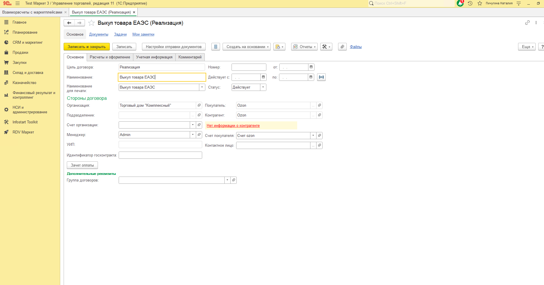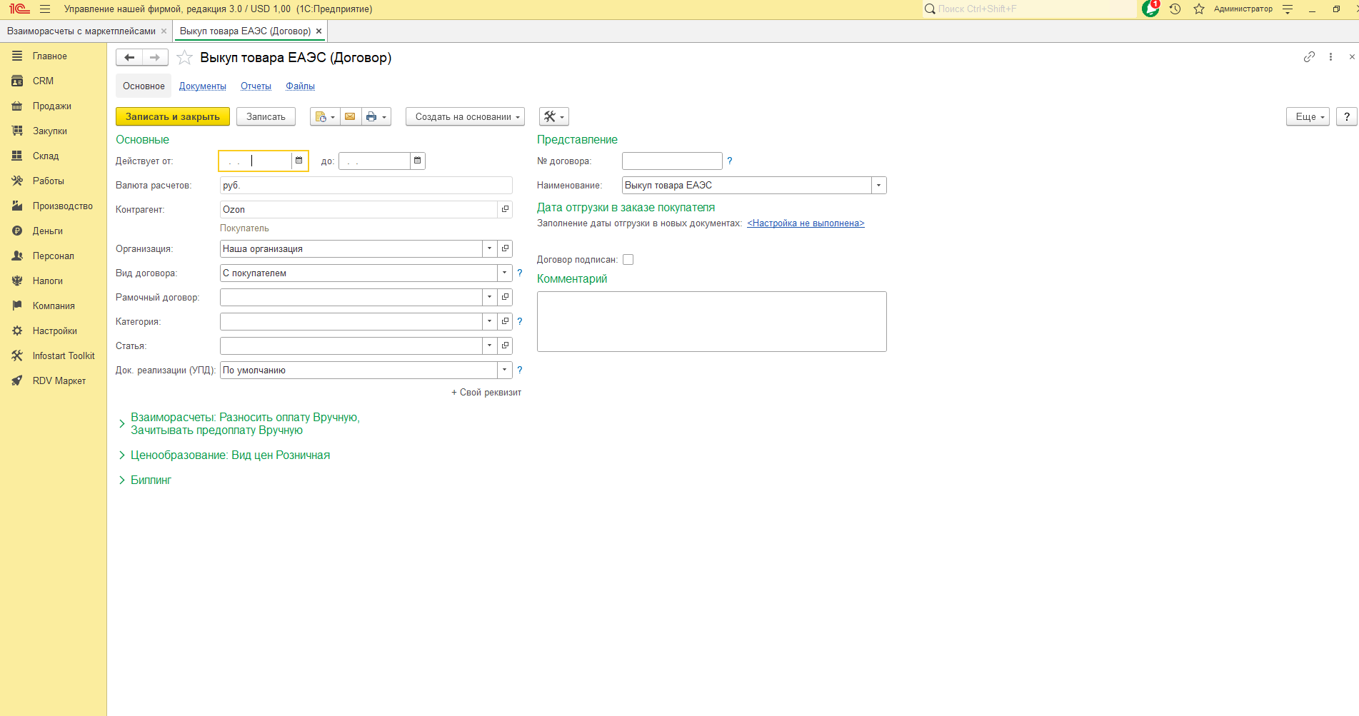 - Договор - договор, по которому будет оформлена продажа товара Ozon, вид договора "С покупателем".
