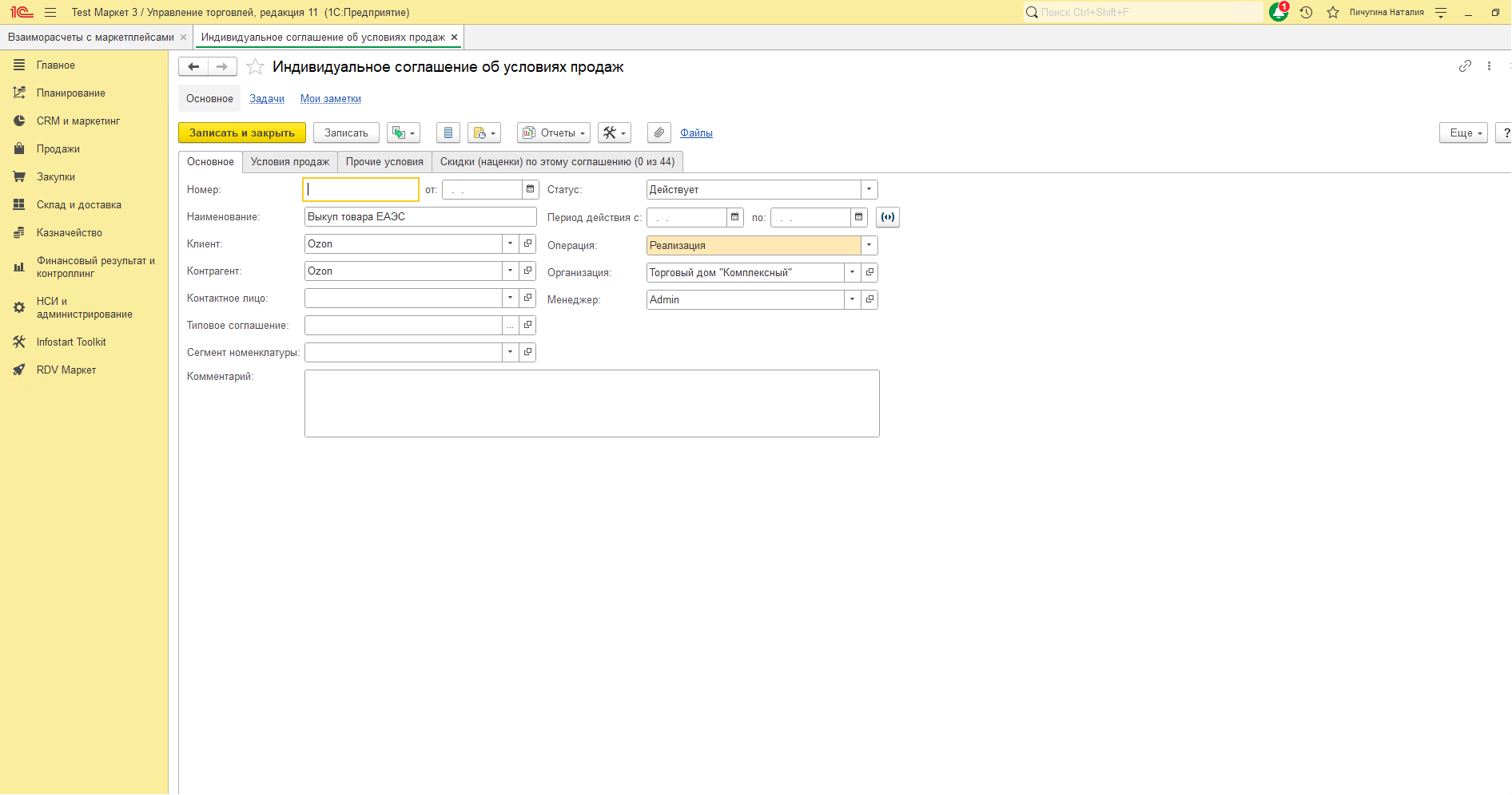 - Соглашение - соглашение, по которому будет оформлена продажа товара Ozon, с операцией "Реализация". Соглашение необходимо указывать только если по ним ведется учет в базе.