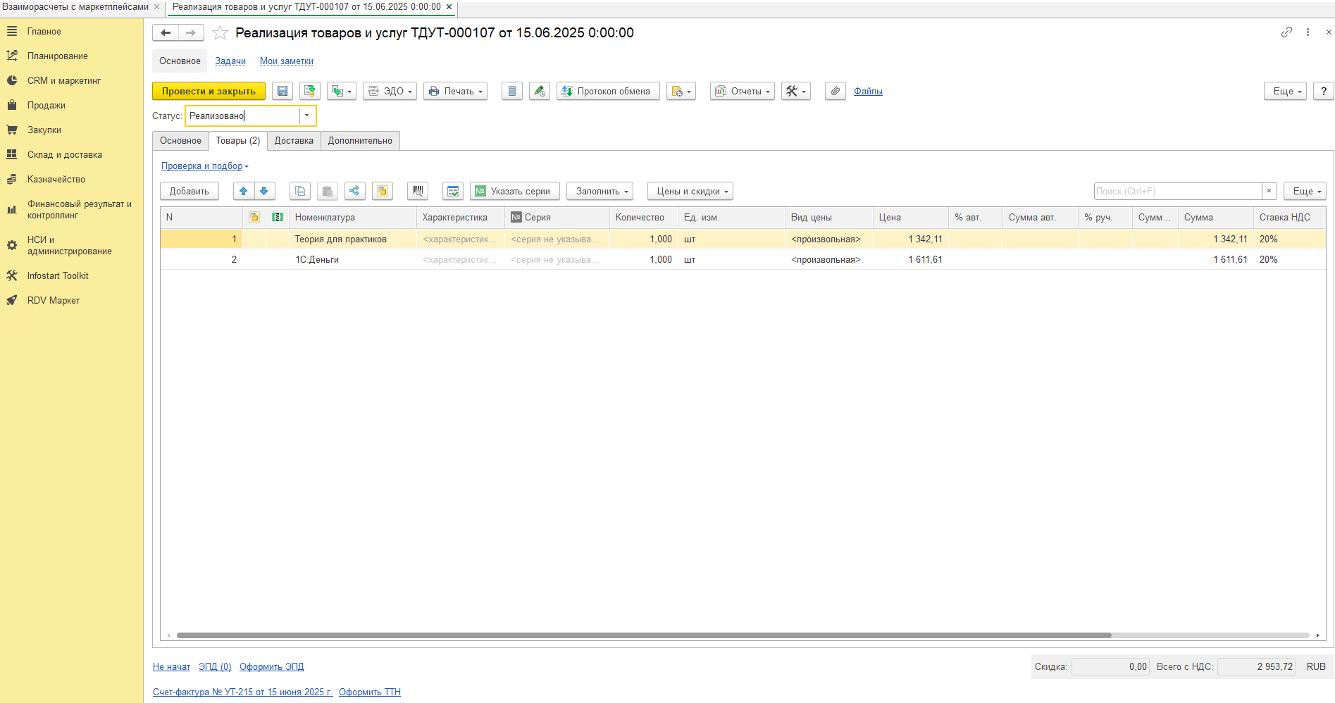 - Реализация товаров и услуг - продажа товара маркетплейсу.