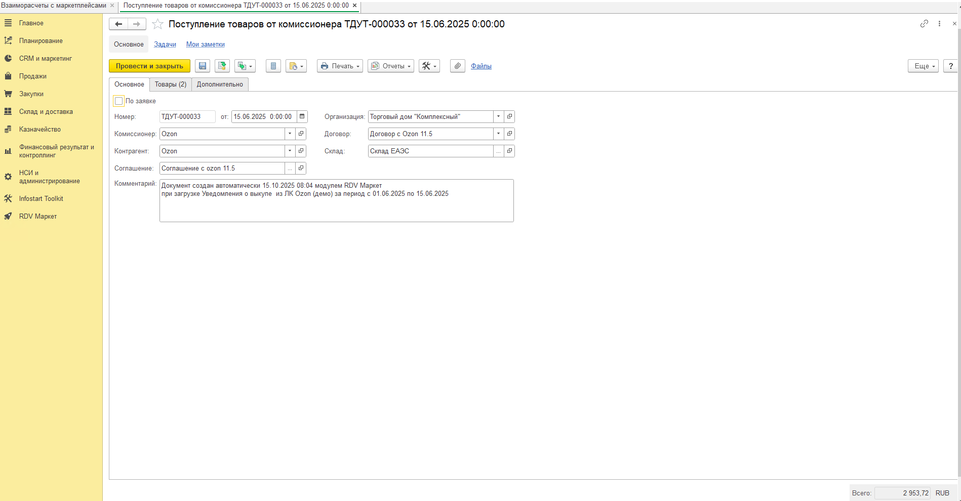 Расходная накладная - продажа товара маркетплейсу: