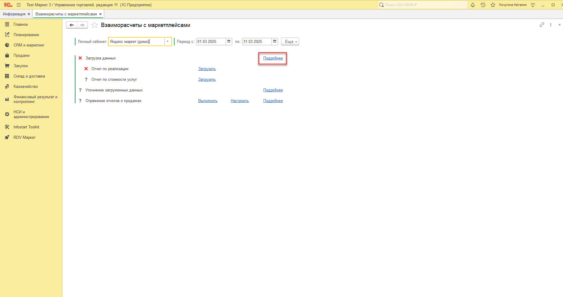 В RDV Маркет загрузка отчета по реализации производится по API. Для загрузки отчета в 1С перейдите в рабочее место "RDV Маркет" - "Взаиморасчёты с маркетплейсами".