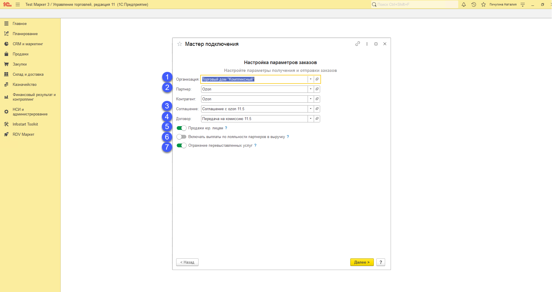- Если в базе включена настройка "Использование соглашений с клиентам", то необходимо указать соглашение для контрагента Ozon.