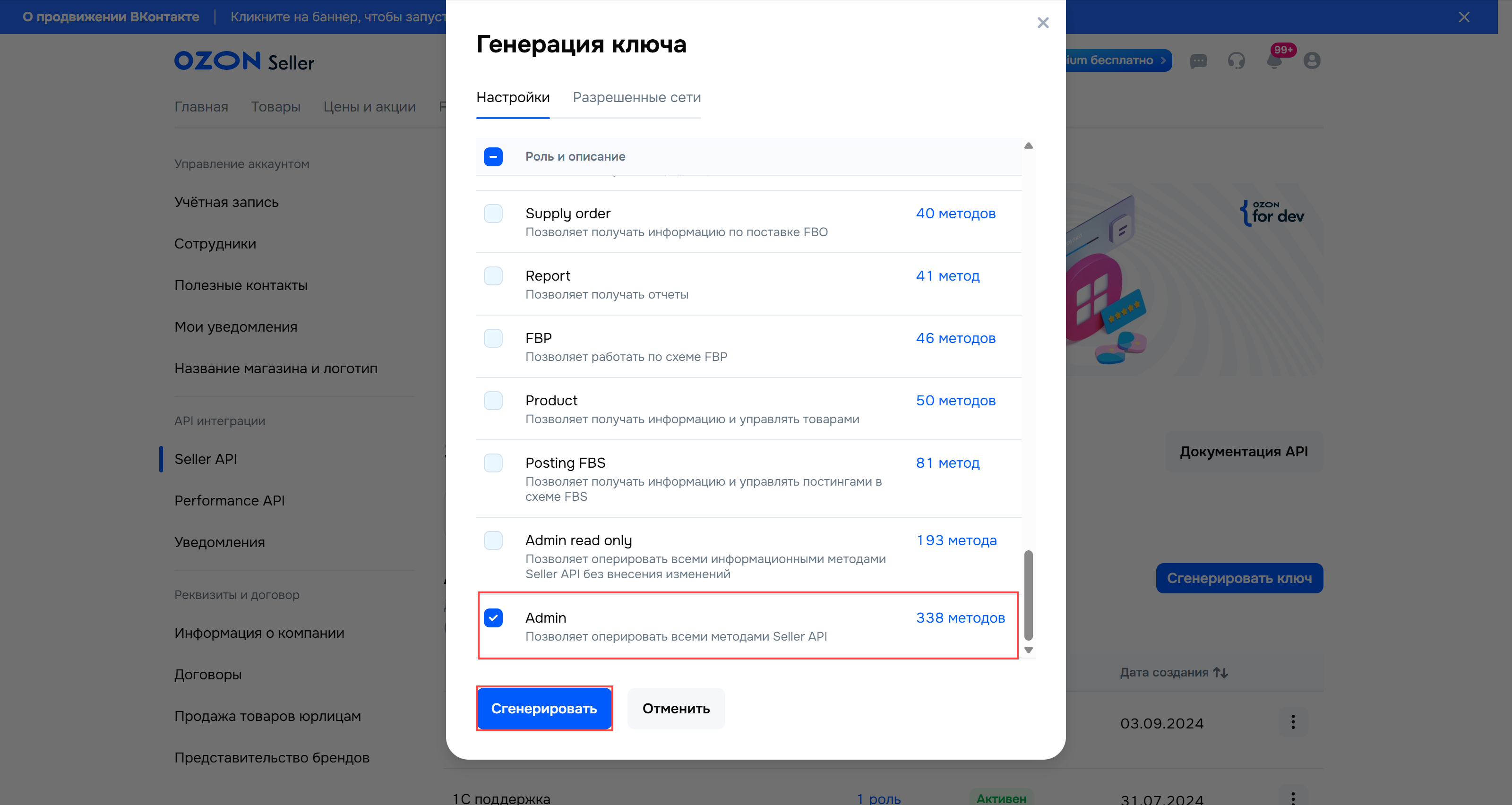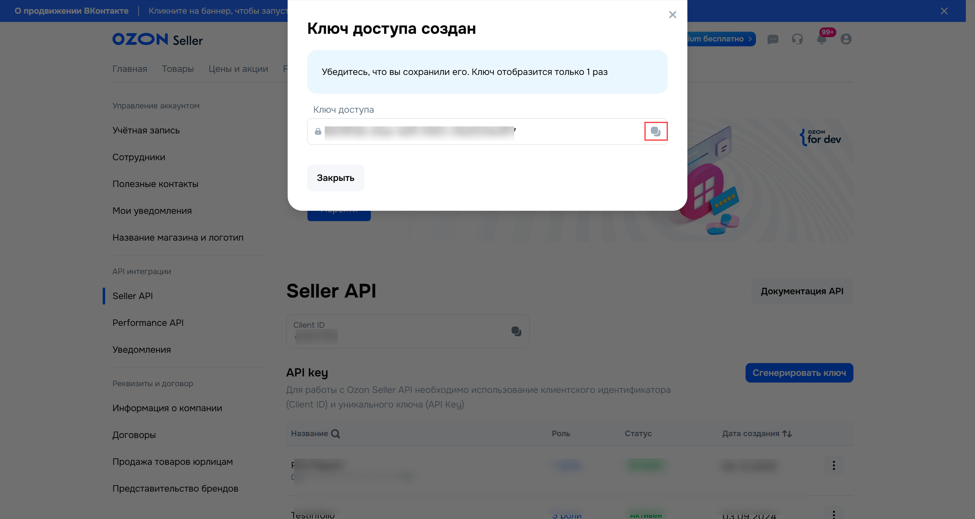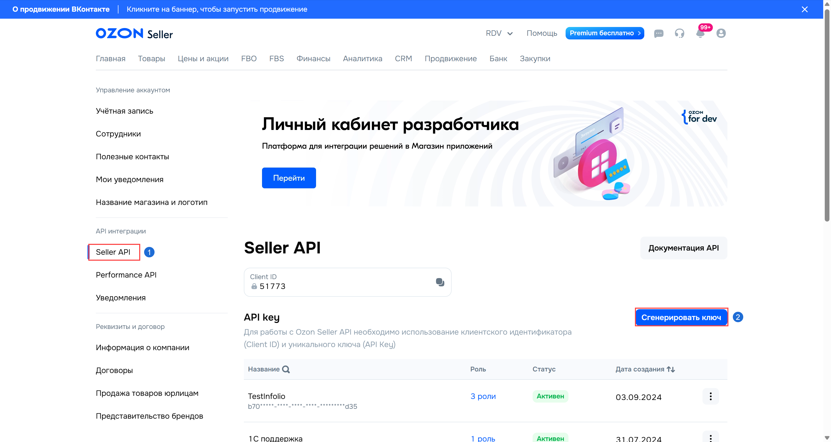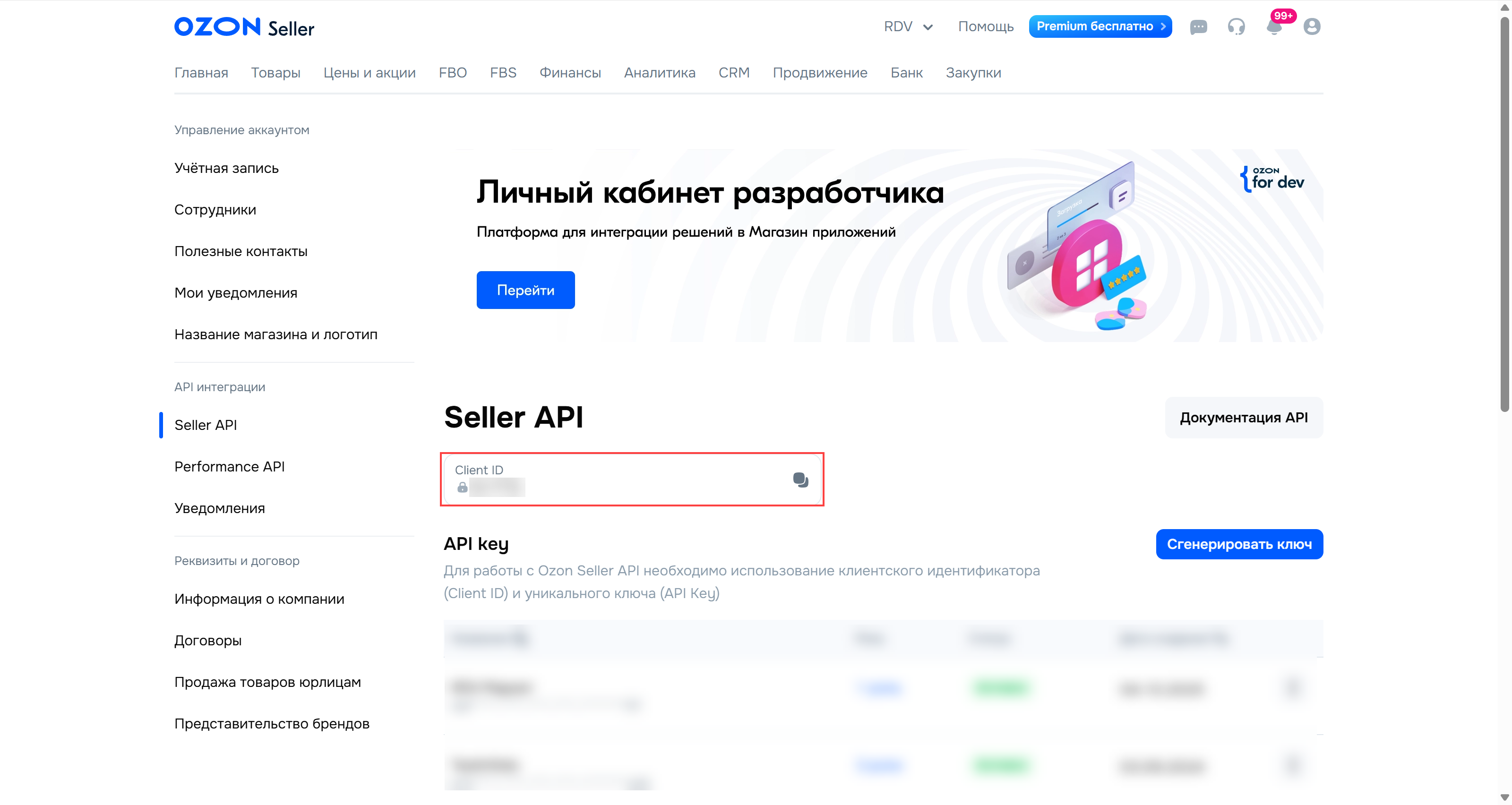 Перейдите на вкладку "Seller API". Сгенерируйте "API key" с помощью кнопки "Сгенерировать ключ".