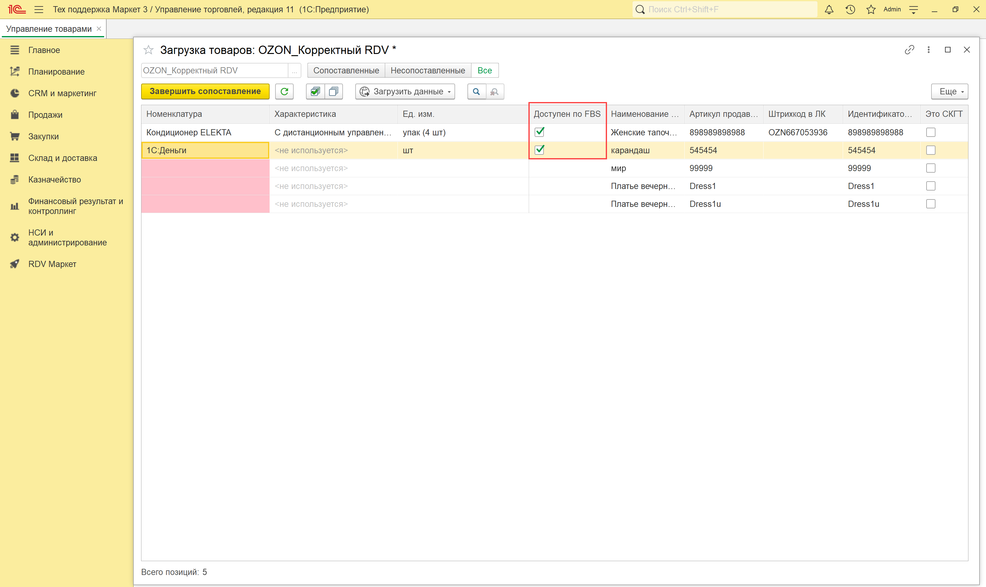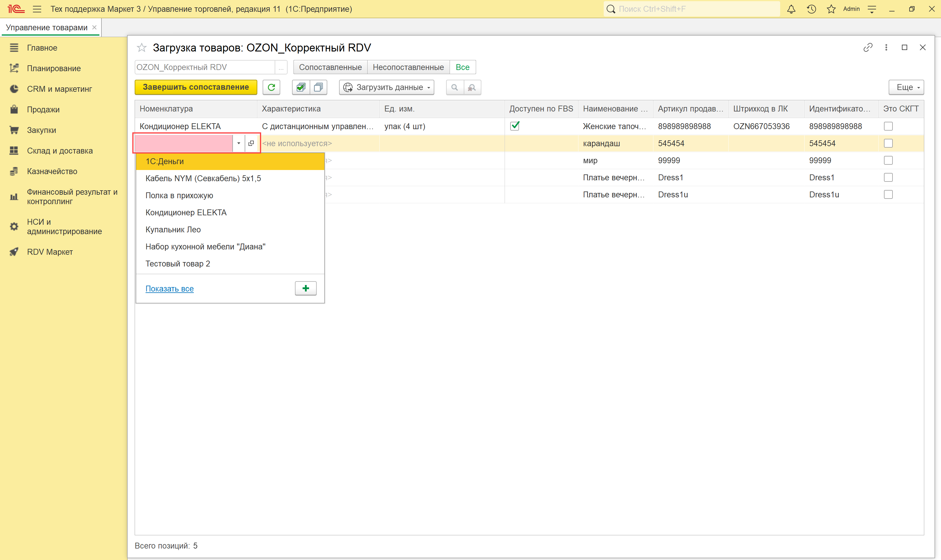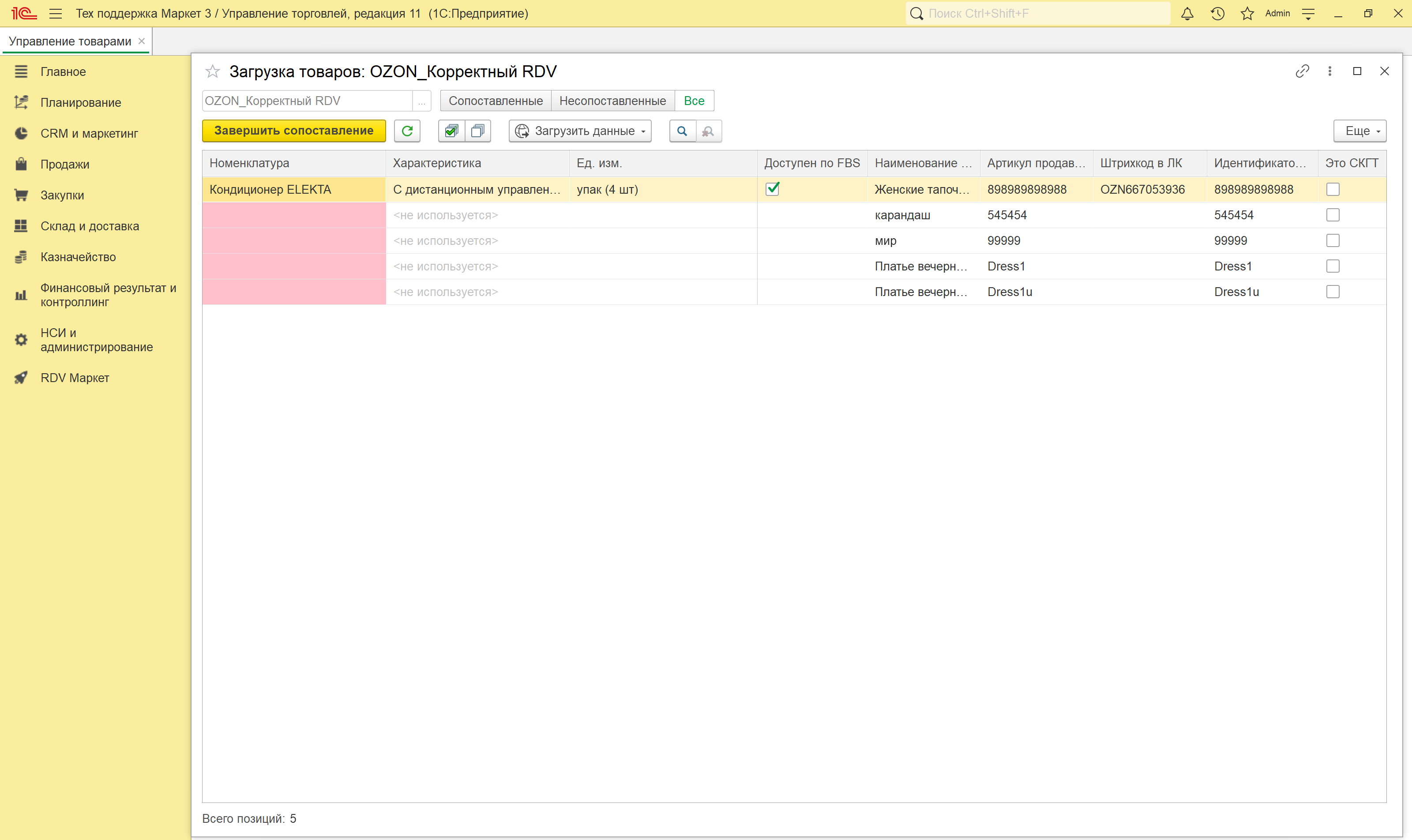 По итогам загрузки товаров по API или из файла открывается новое окно, в котором происходит сопоставление товаров маркетплейса и номенклатуры в 1С.