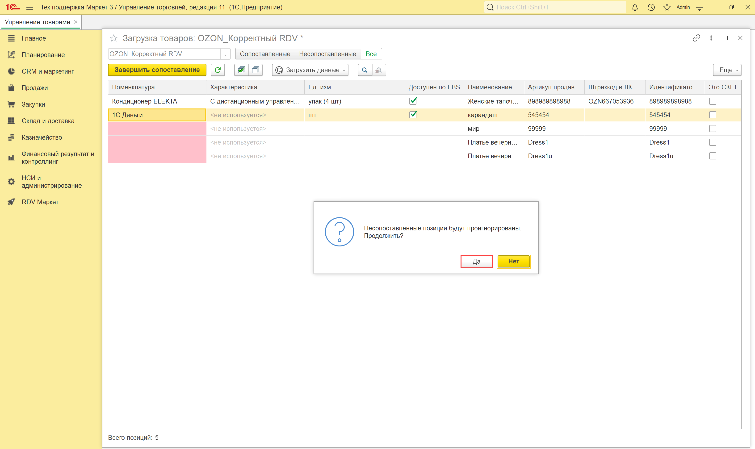 Если остались несопоставленные товары, то появятся соответствующее предупреждение. Нажатие "Да" завершит работу с товарами, а "Нет" - вернет окно загрузки товаров в работу: