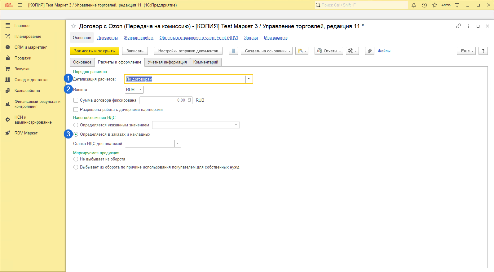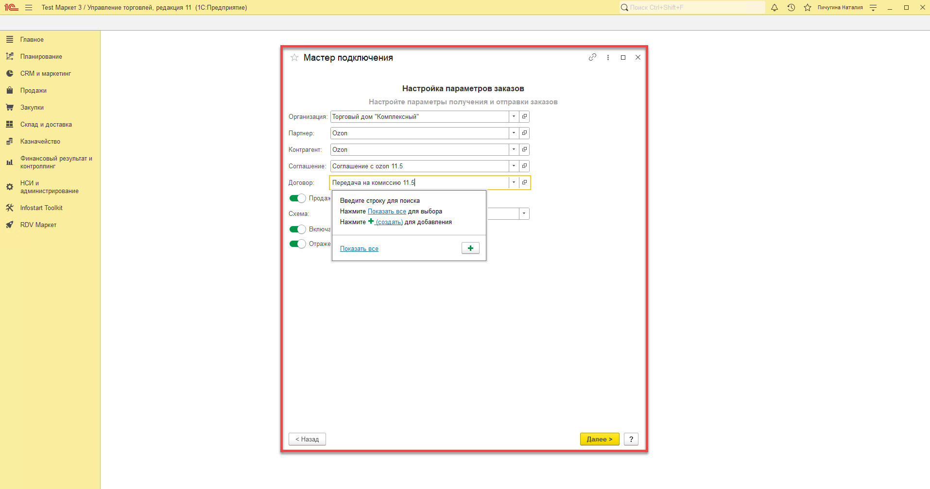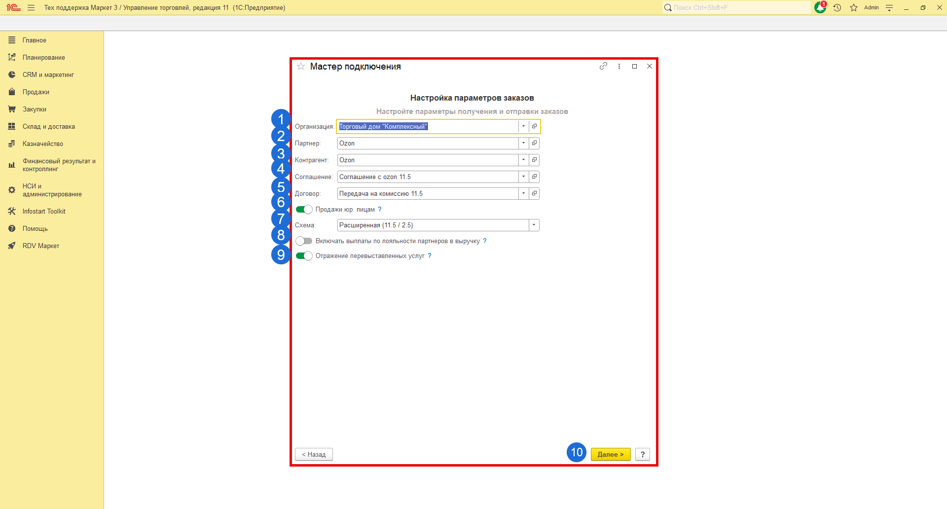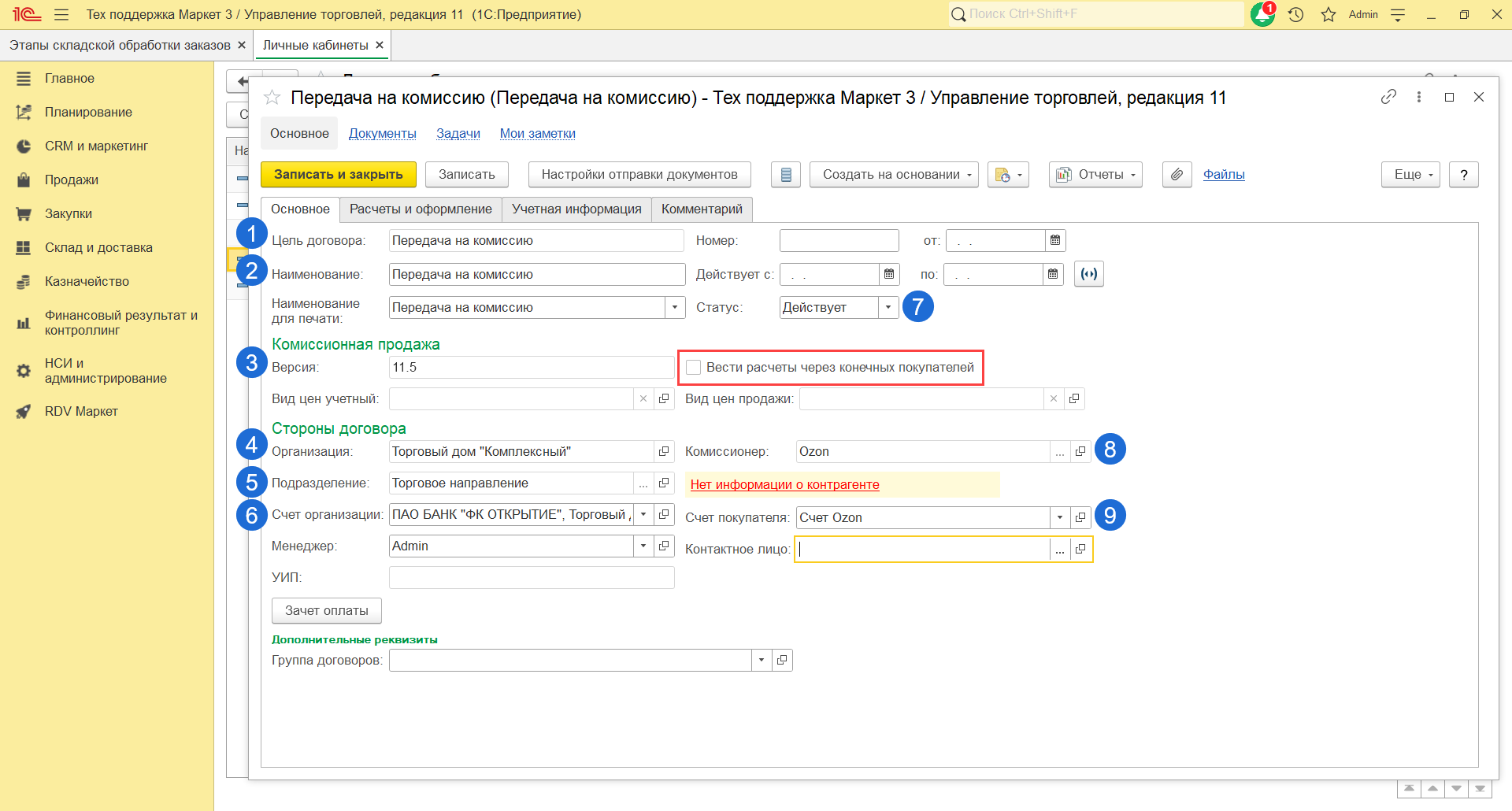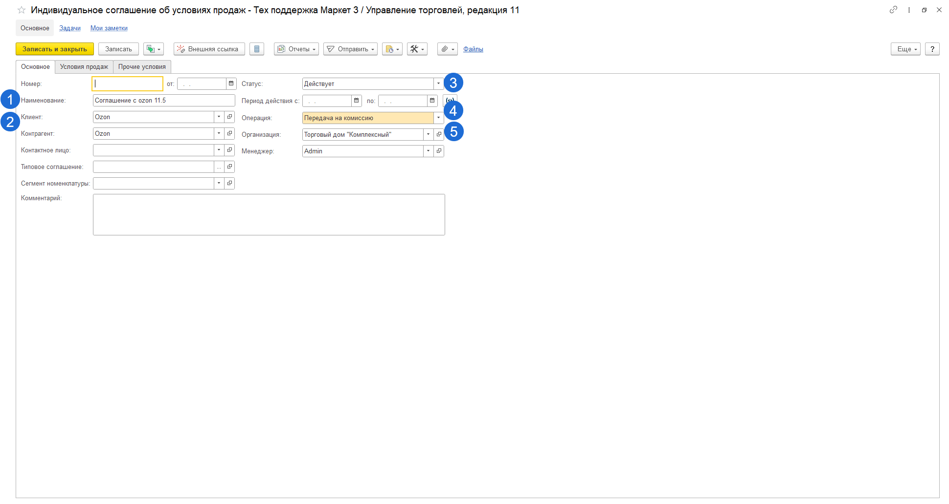- Если в базе включена настройка "Использование соглашений с клиентам", то укажите соглашение для контрагента Ozon.