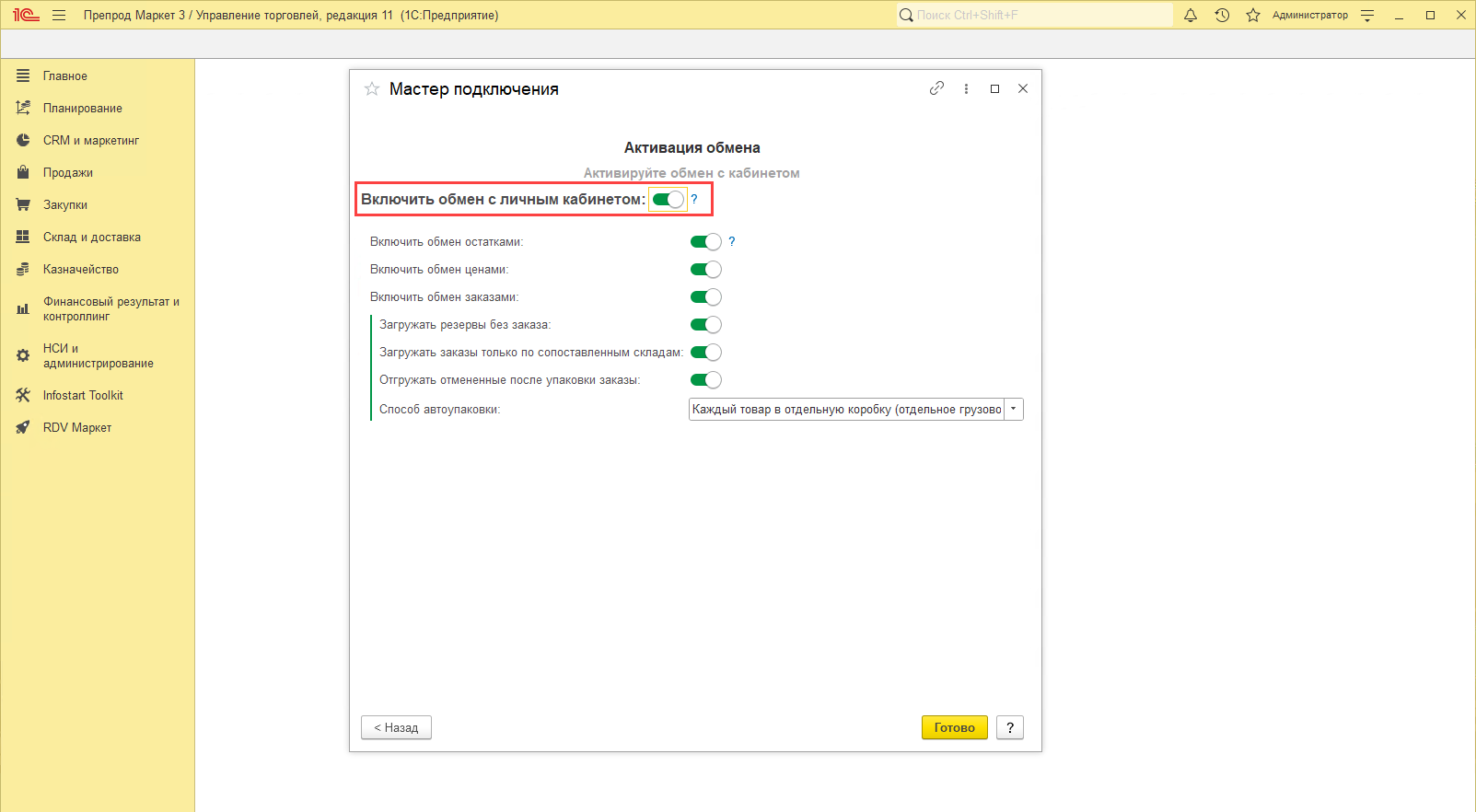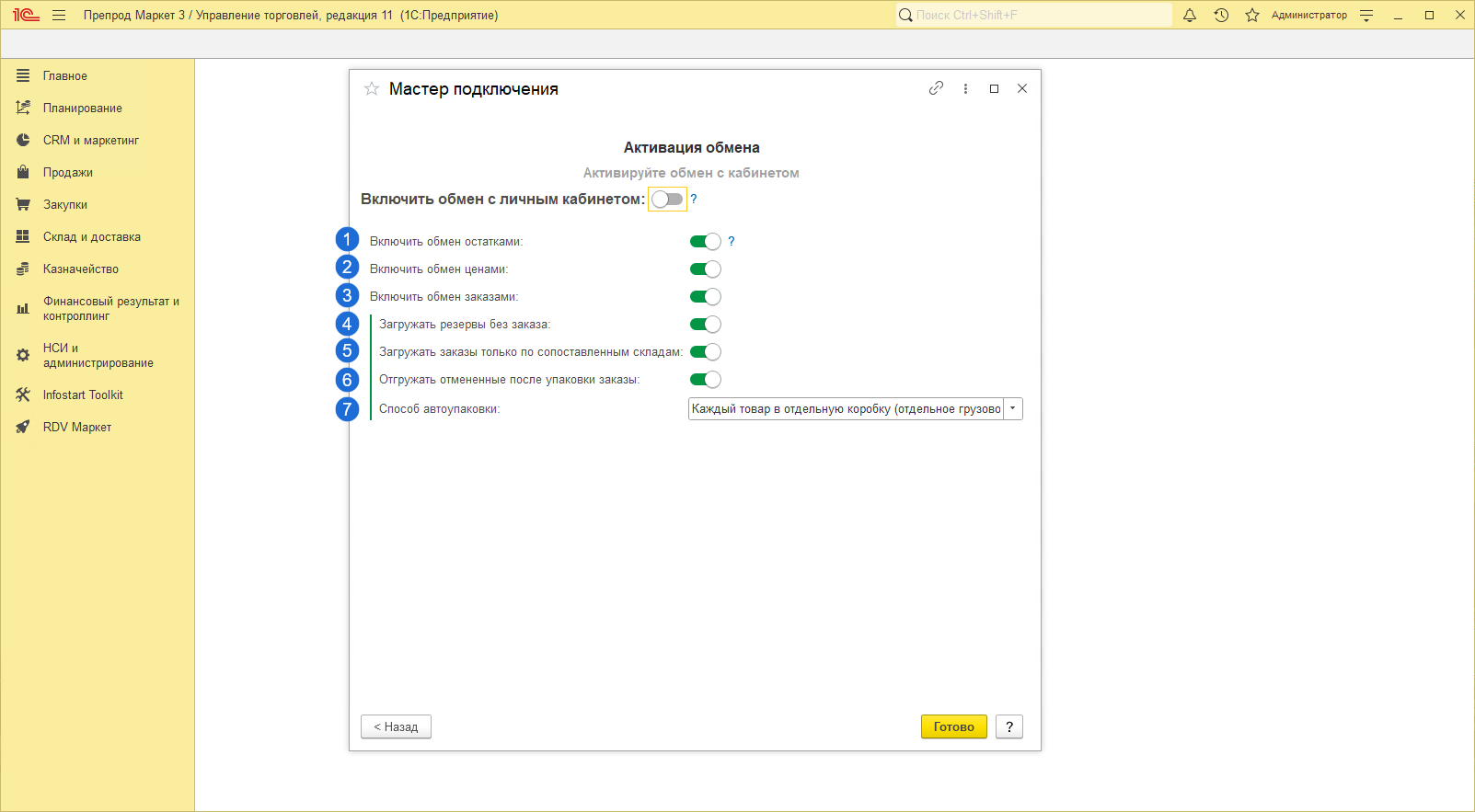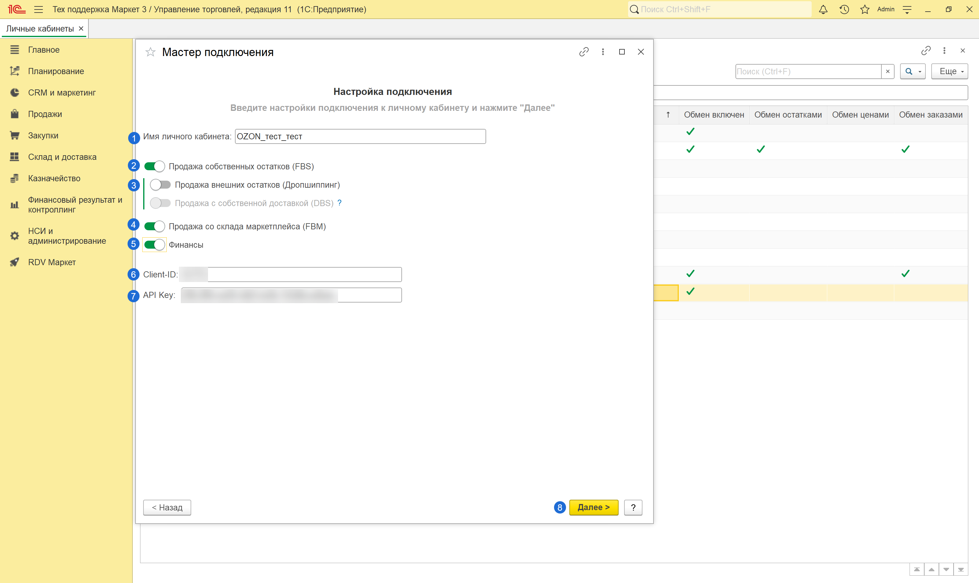 После чего необходимо Включить обмен с личным кабинетом для активации всех выбранных ранее обменов и нажать кнопку "Далее":