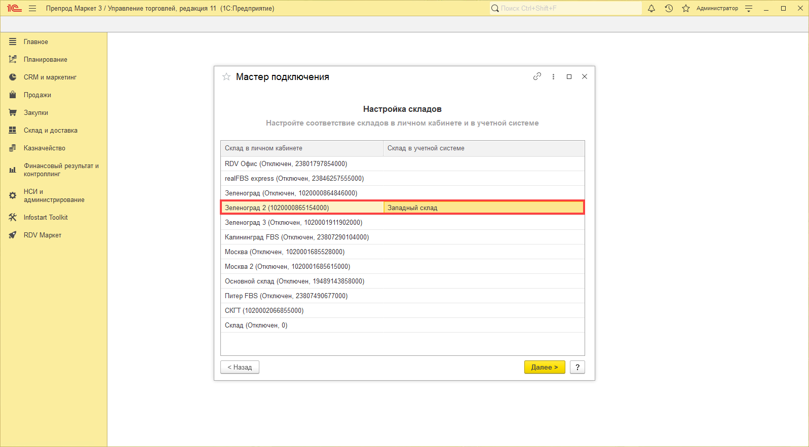 На данном шаге необходимо выполнить сопоставление как минимум одного склада в личном кабинете маркетплейса и склада в учетной системе для работы по схеме FBS.