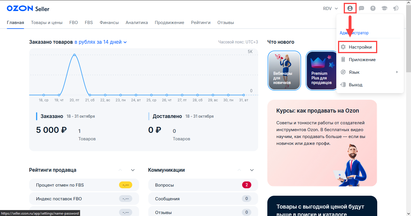 Параметры "Client-ID" и "API Key" находятся в личном кабинете Ozon. Нажмите на иконку своего пользователя, чтобы открыть настройки.
