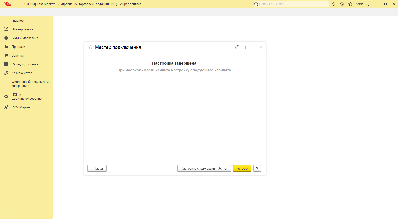 Можно начать настройку следующего кабинета или выйти из мастера подключения по кнопке "Готово":