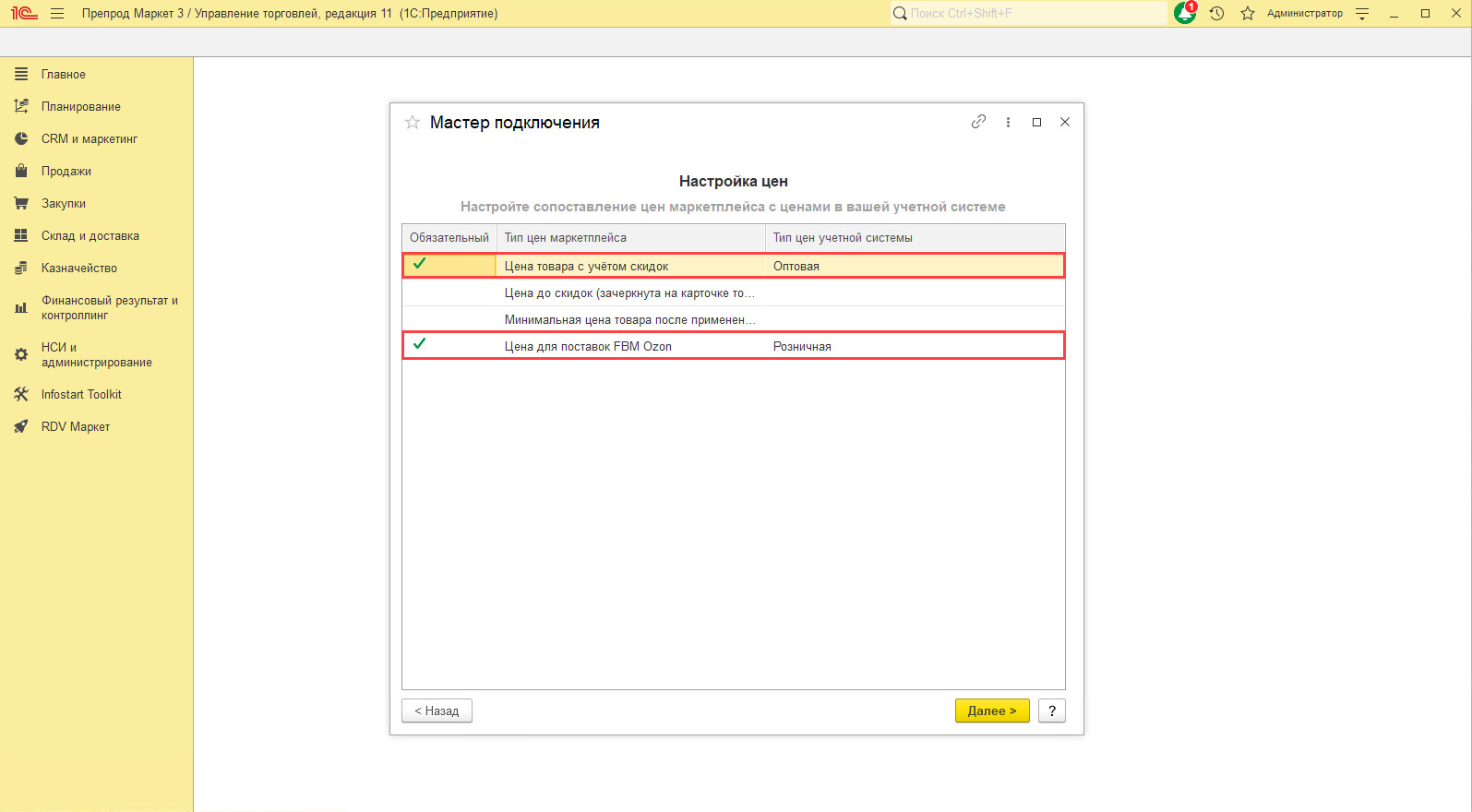 Выполните сопоставление цен из личного кабинета и видов цен в учетной системе.