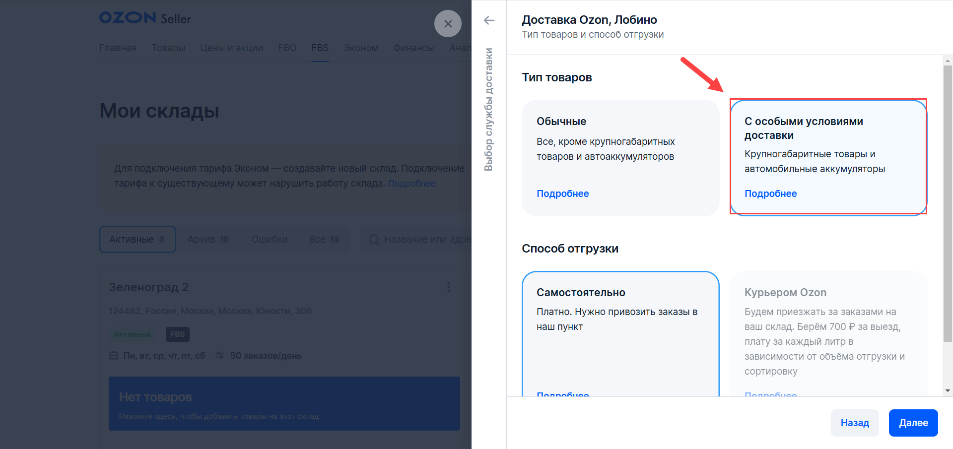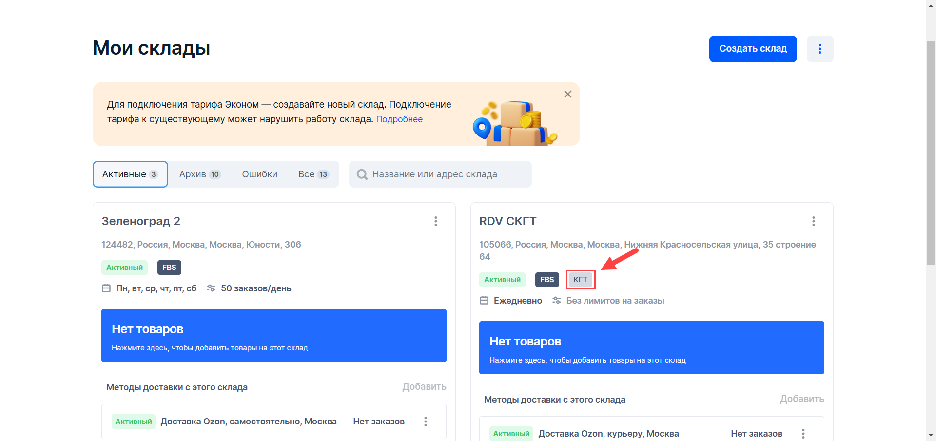 Для передачи остатков и отгрузки заказов с СКГТ товарами необходим отдельный склад в ЛК Озон.