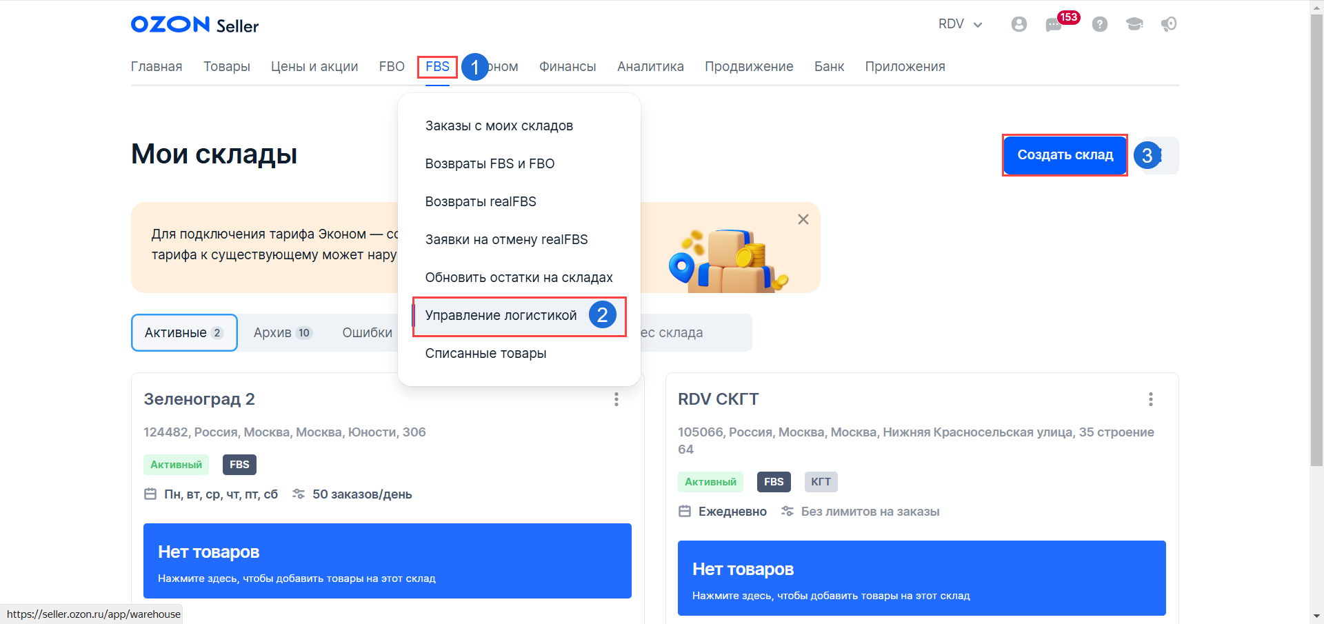 1. Перейдите в раздел "FBS" - "Управление логистикой" - "Создать новый склад":