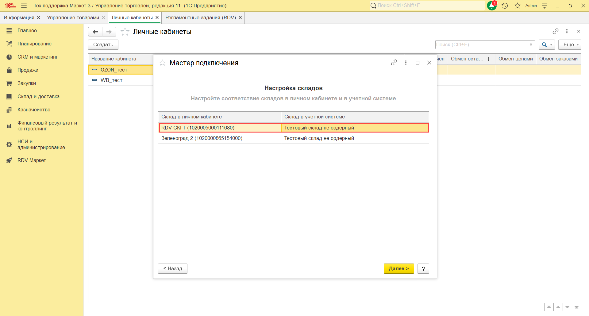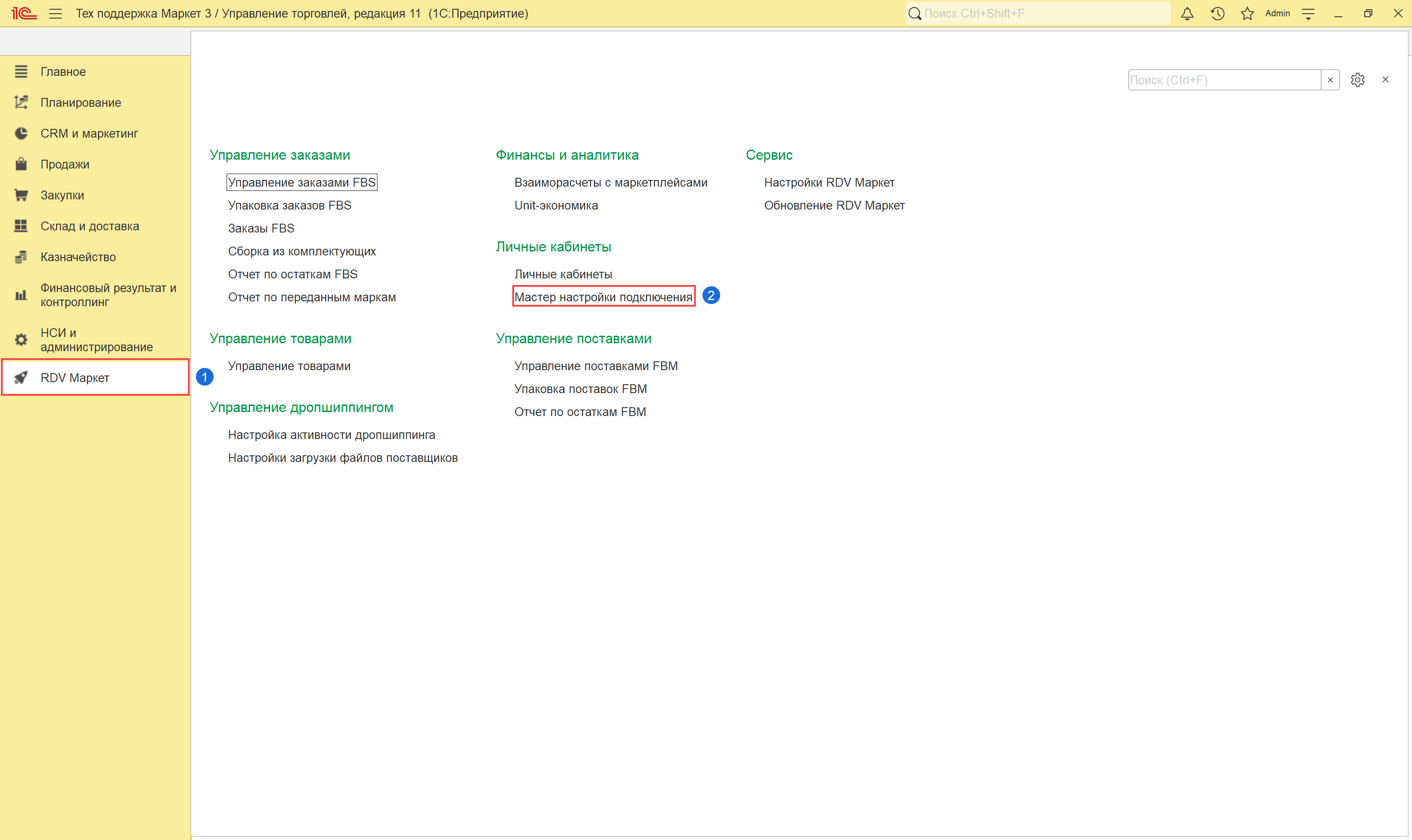 Для настройки личного кабинета необходимо перейти в раздел "RDV Маркет" - "Мастер настройки подключения".