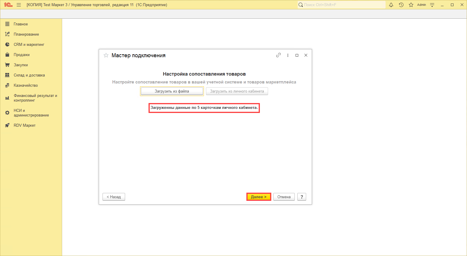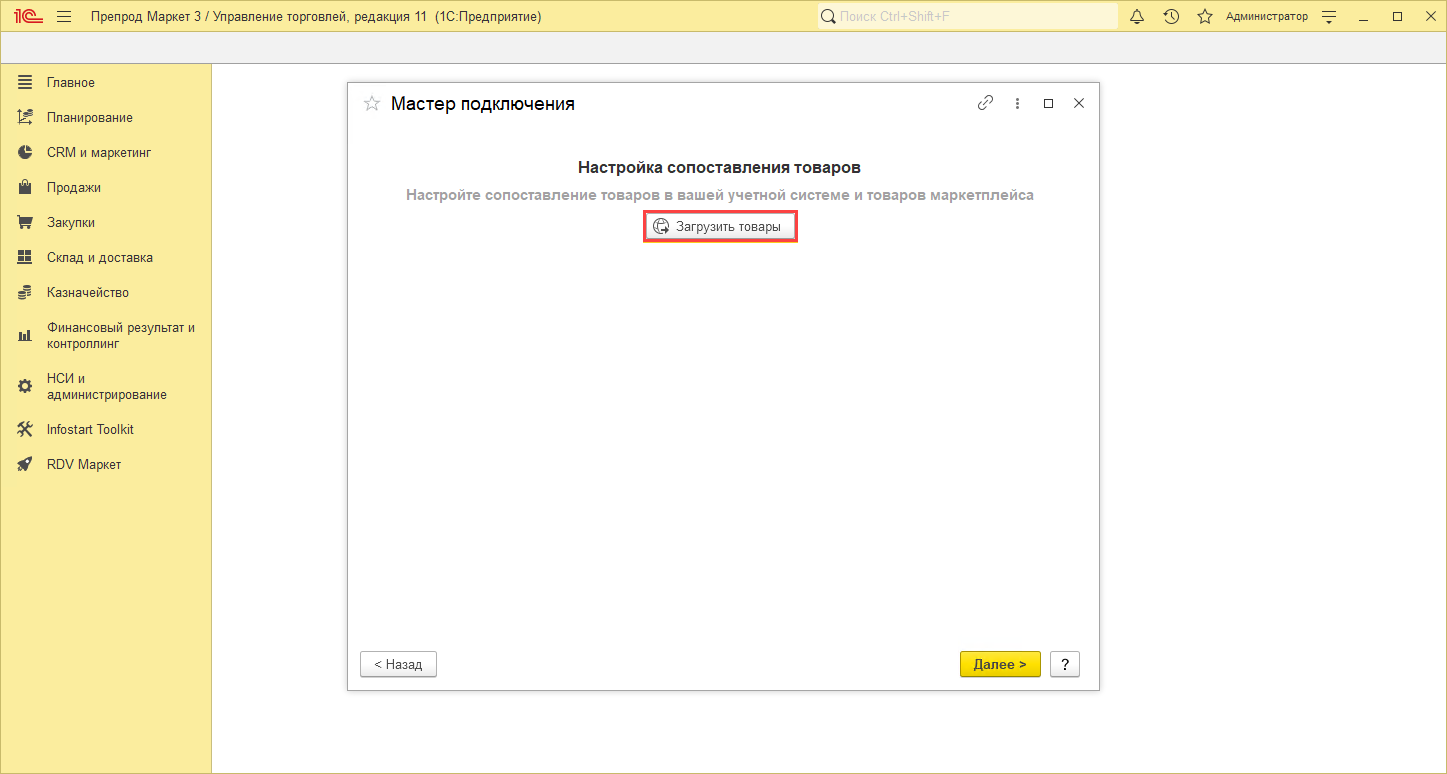 На данном шаге необходимо сопоставить товары маркетплейса с номенклатурой в 1C.