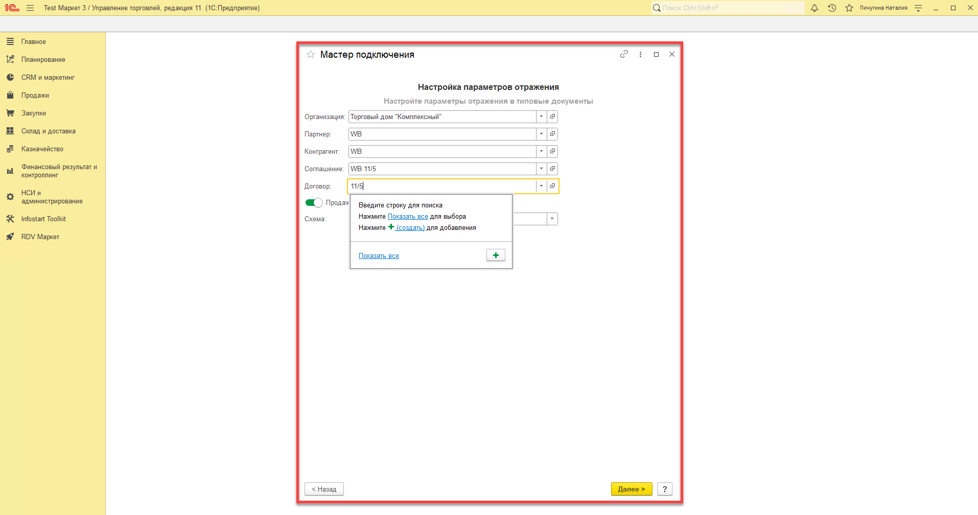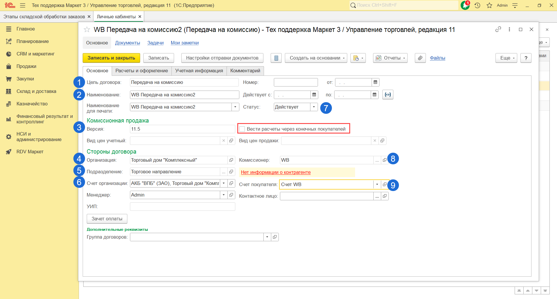 - Если в базе включена настройка "Использование соглашений с клиентам", то укажите соглашение для контрагента Wildberries.