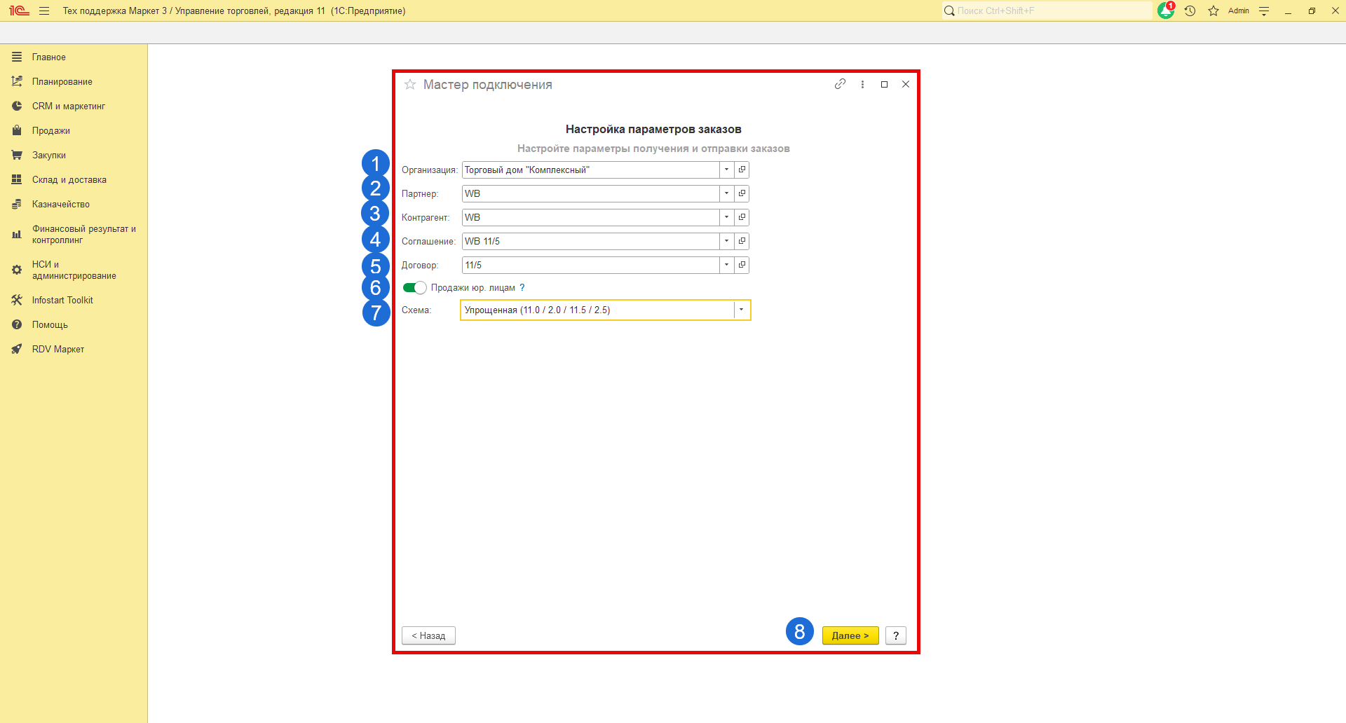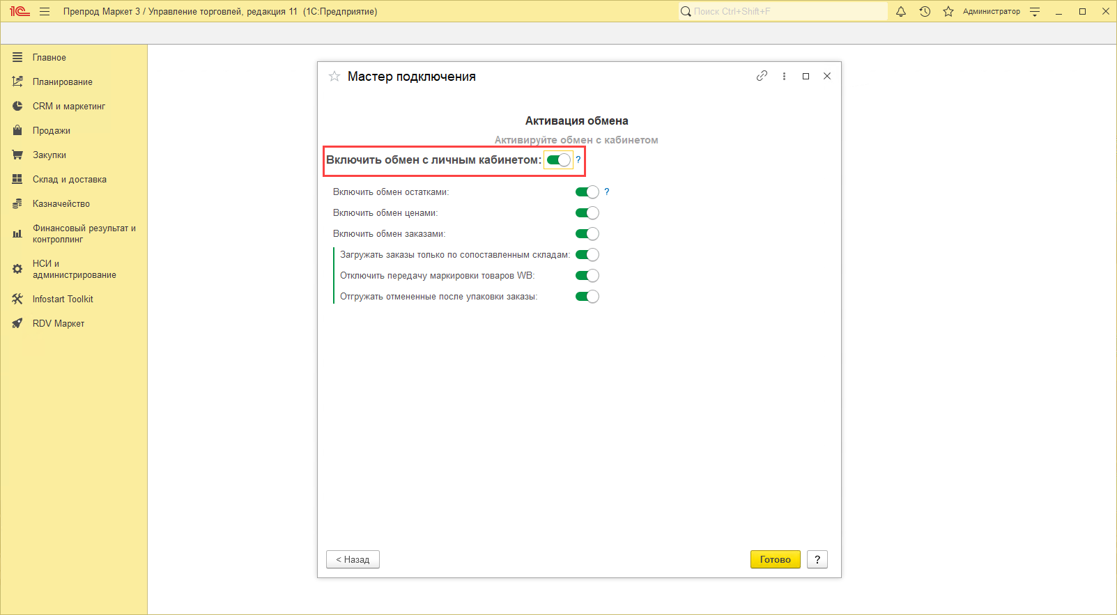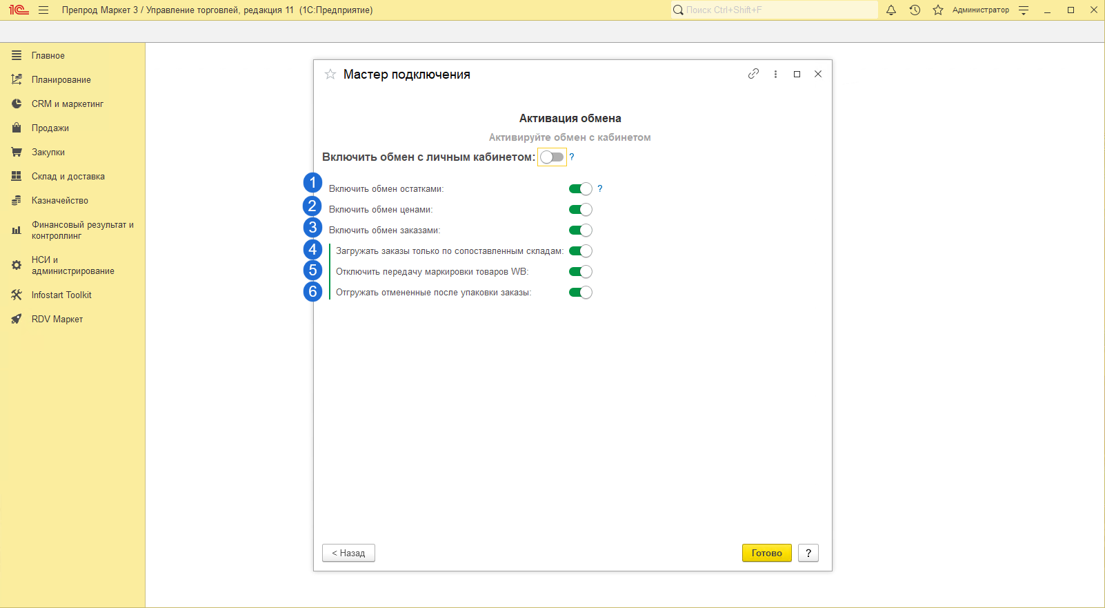 После чего, необходимо "Включить обмен с личным кабинетом" для активации всех выбранных ранее обменов и нажать кнопку "Далее":