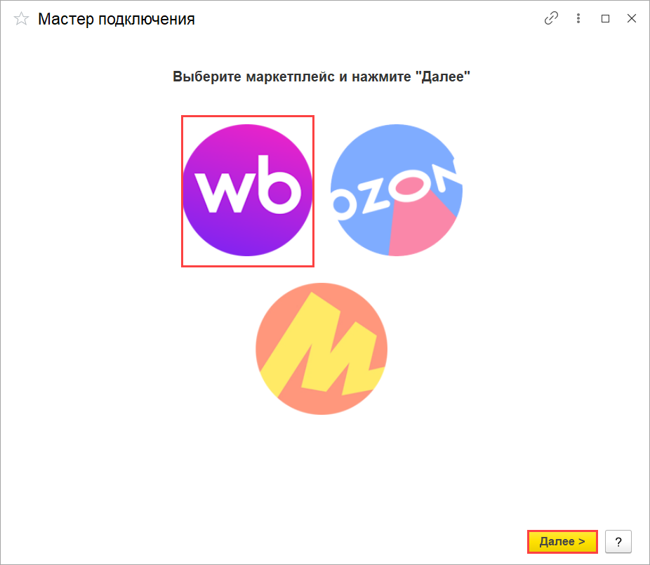 Если в базе 1С включены корректно все настройки учета, то открывается окно с выбором маркетплейса, для которого будет настраиваться подключение.