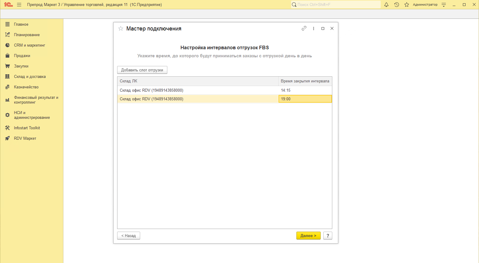 Здесь можно настроить временные интервалы (слоты), в течение которых заказы будут автоматически собираться в одну общую отгрузку для передачи в службу доставки.