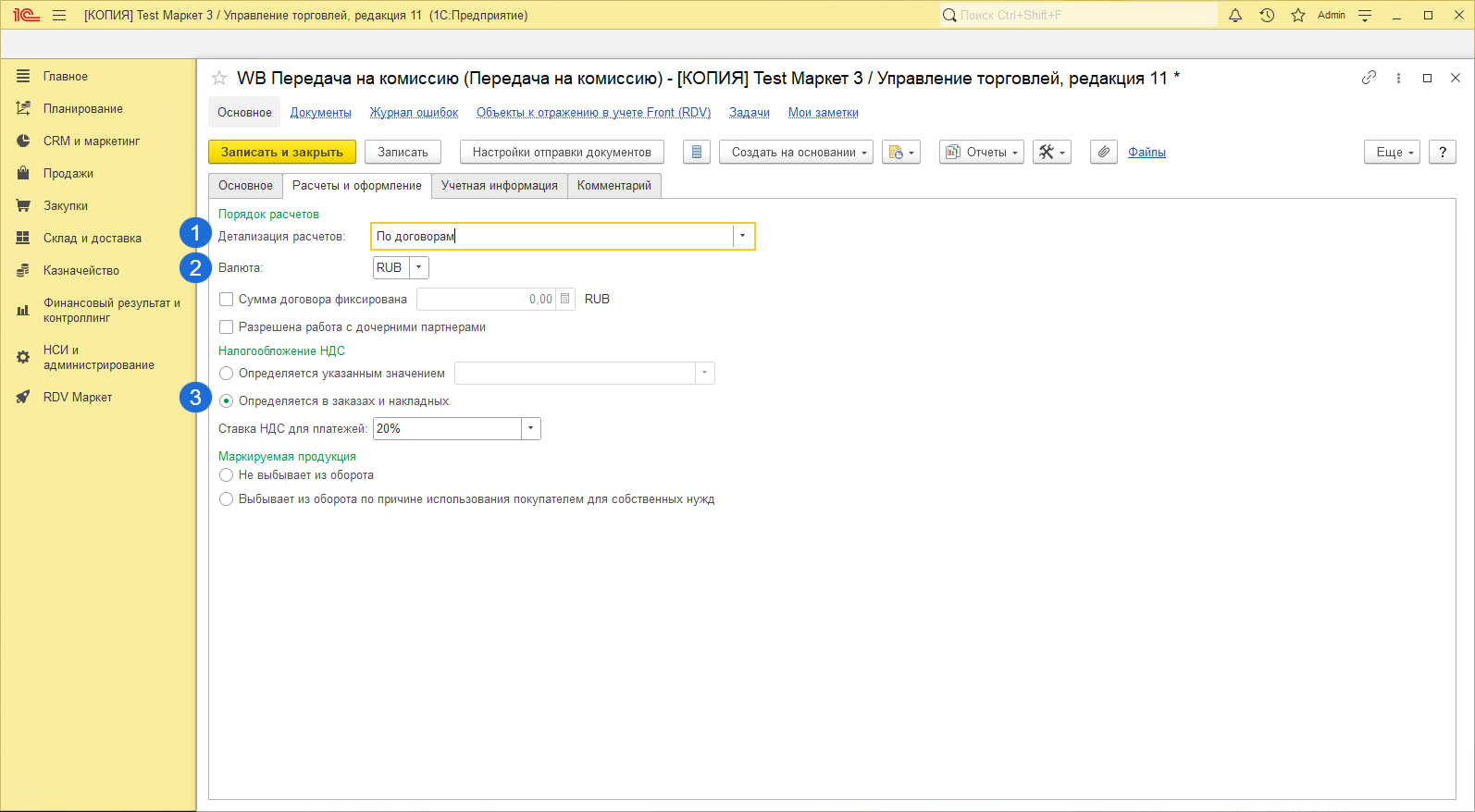 Если используется синхронизация с 1С БП, требуется выполнять настройку по схеме комиссионной продажи 11.0 / 2.0. Подробнее об отличиях комиссионных схем.