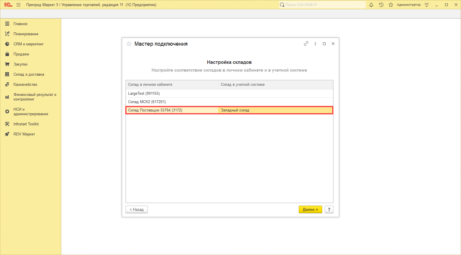На данном шаге необходимо выполнить сопоставление как минимум одного склада в личном кабинете маркетплейса и склада в учетной системе.
