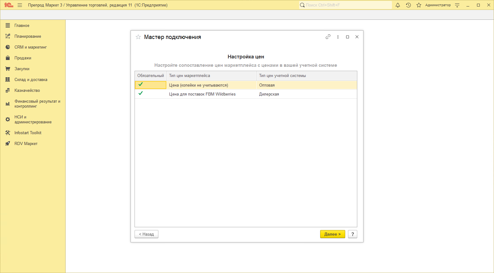 Выполните сопоставление цен из личного кабинета и видов цен в учетной системе.