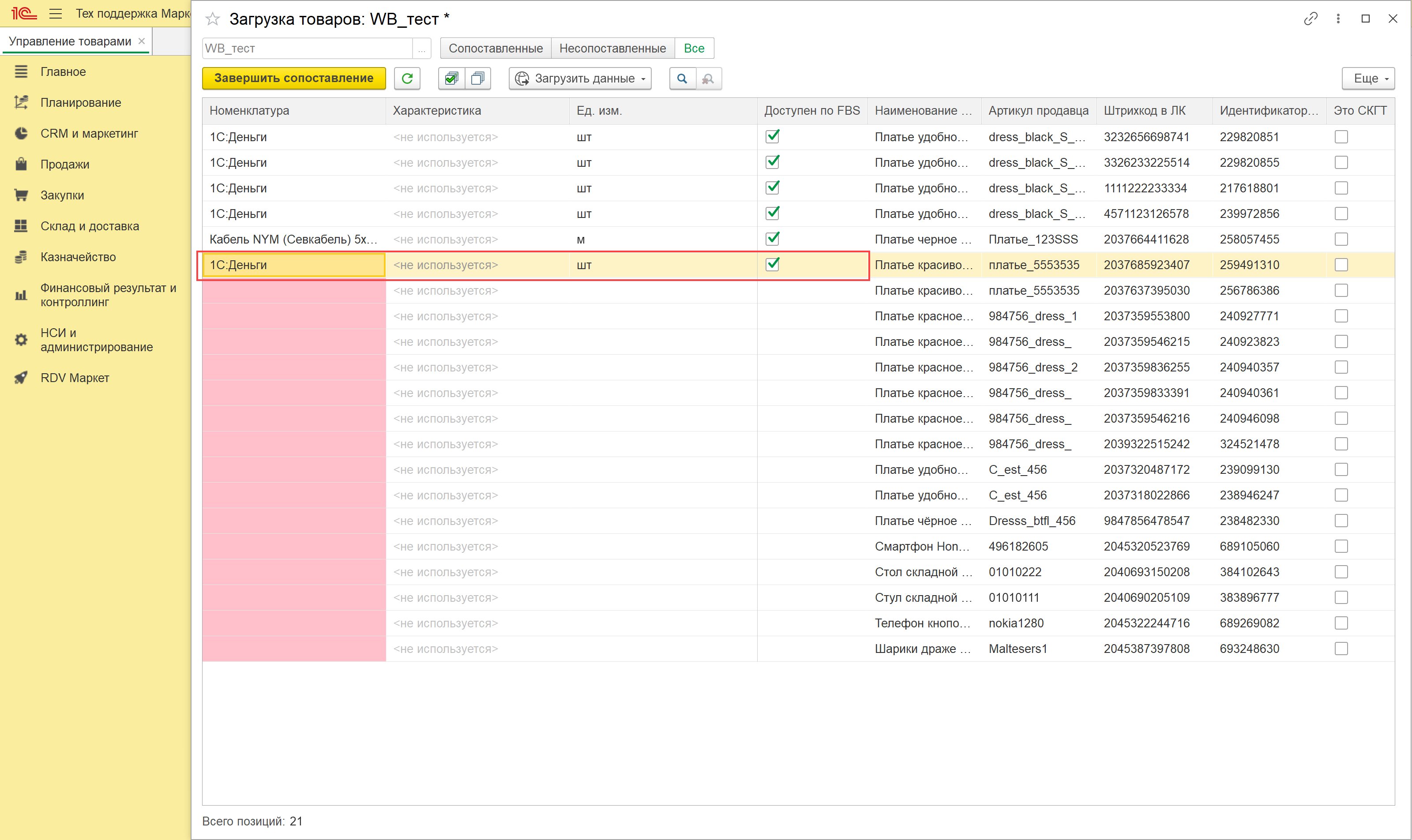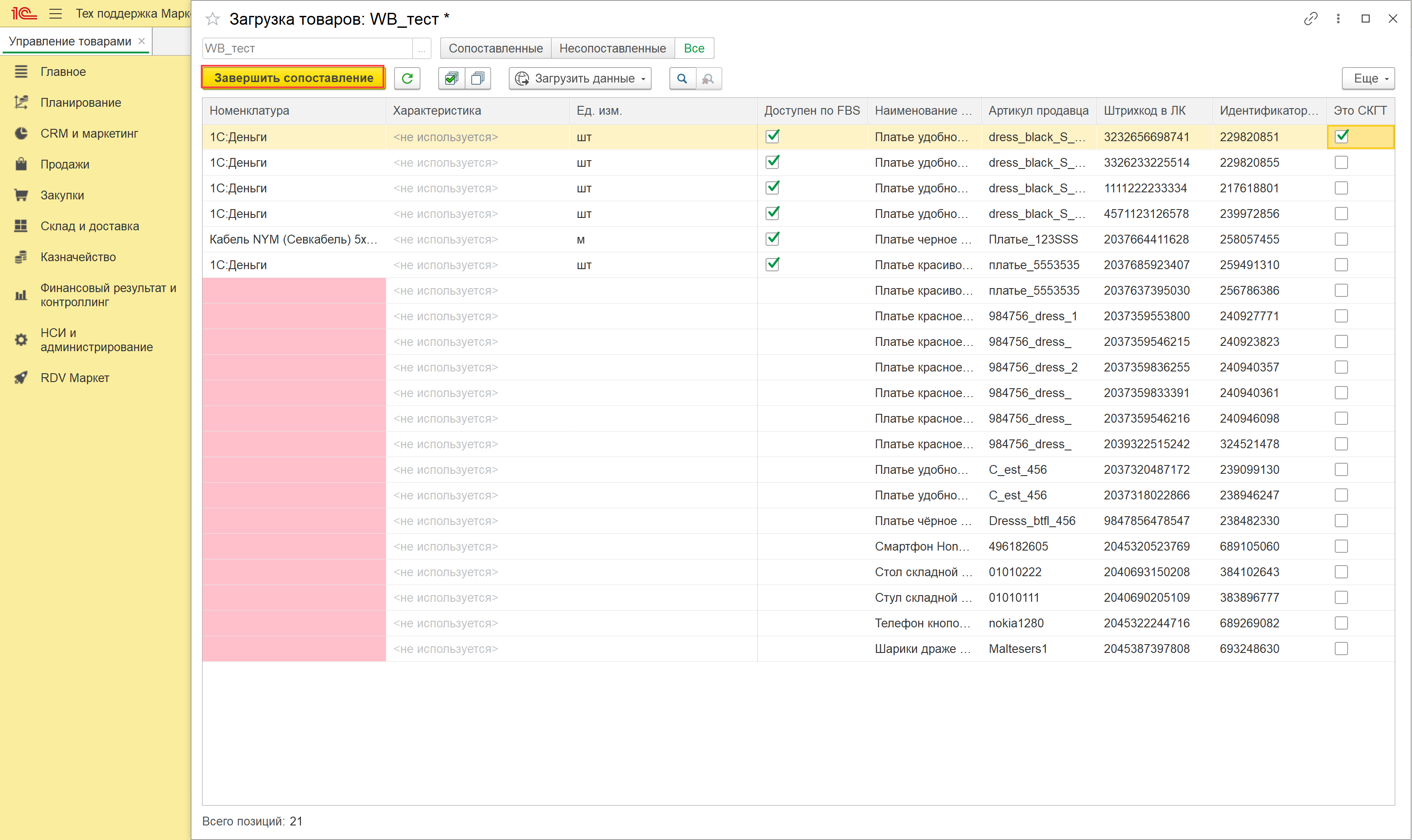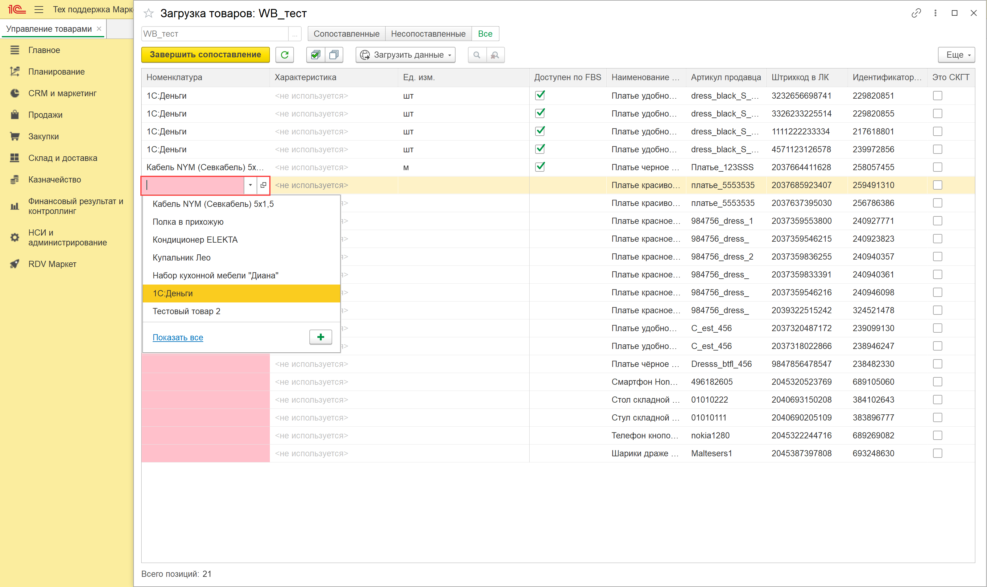 По итогам загрузки по API или из файла открывается новое окно, в котором происходит сопоставление товаров маркетплейса и номенклатуры в 1С.