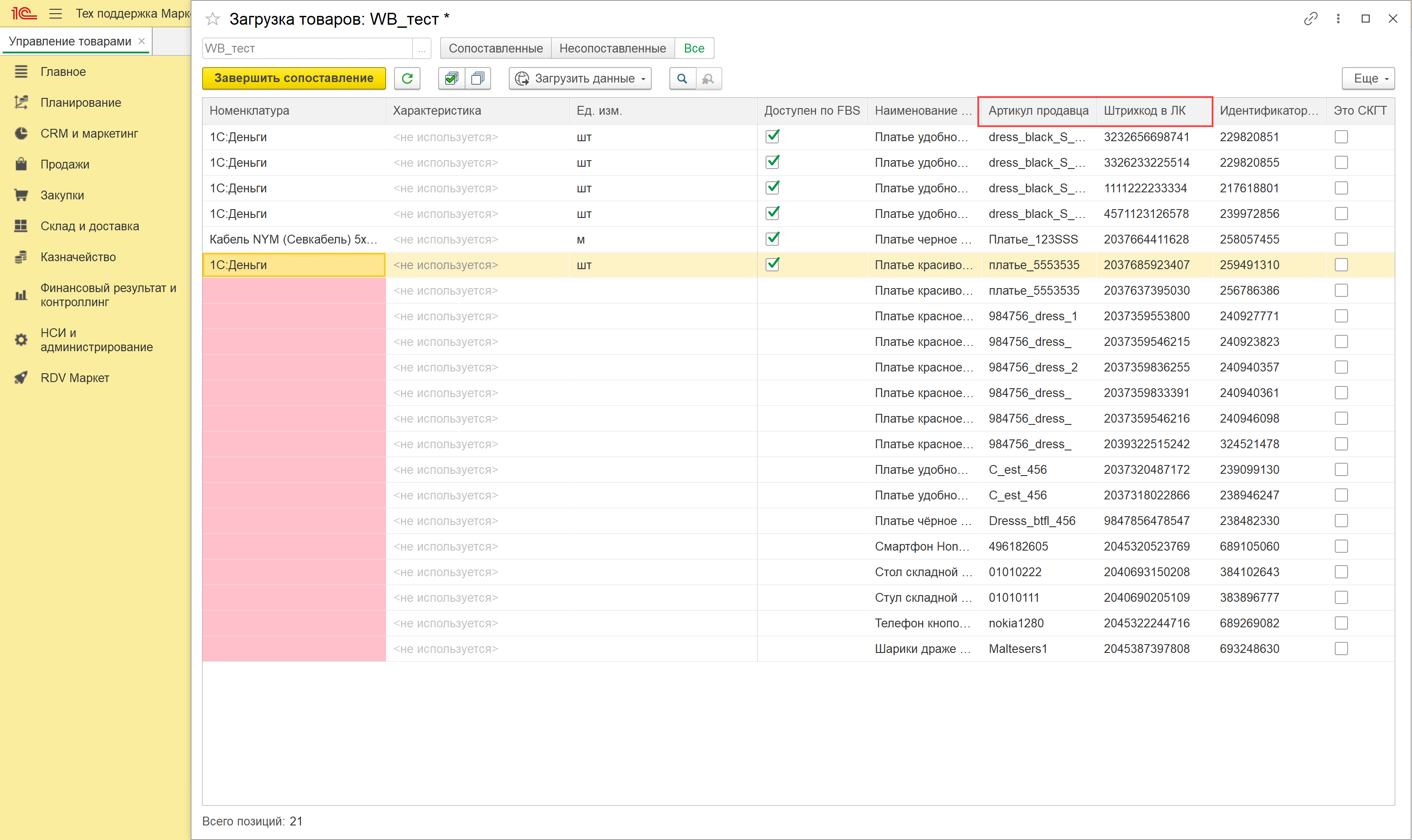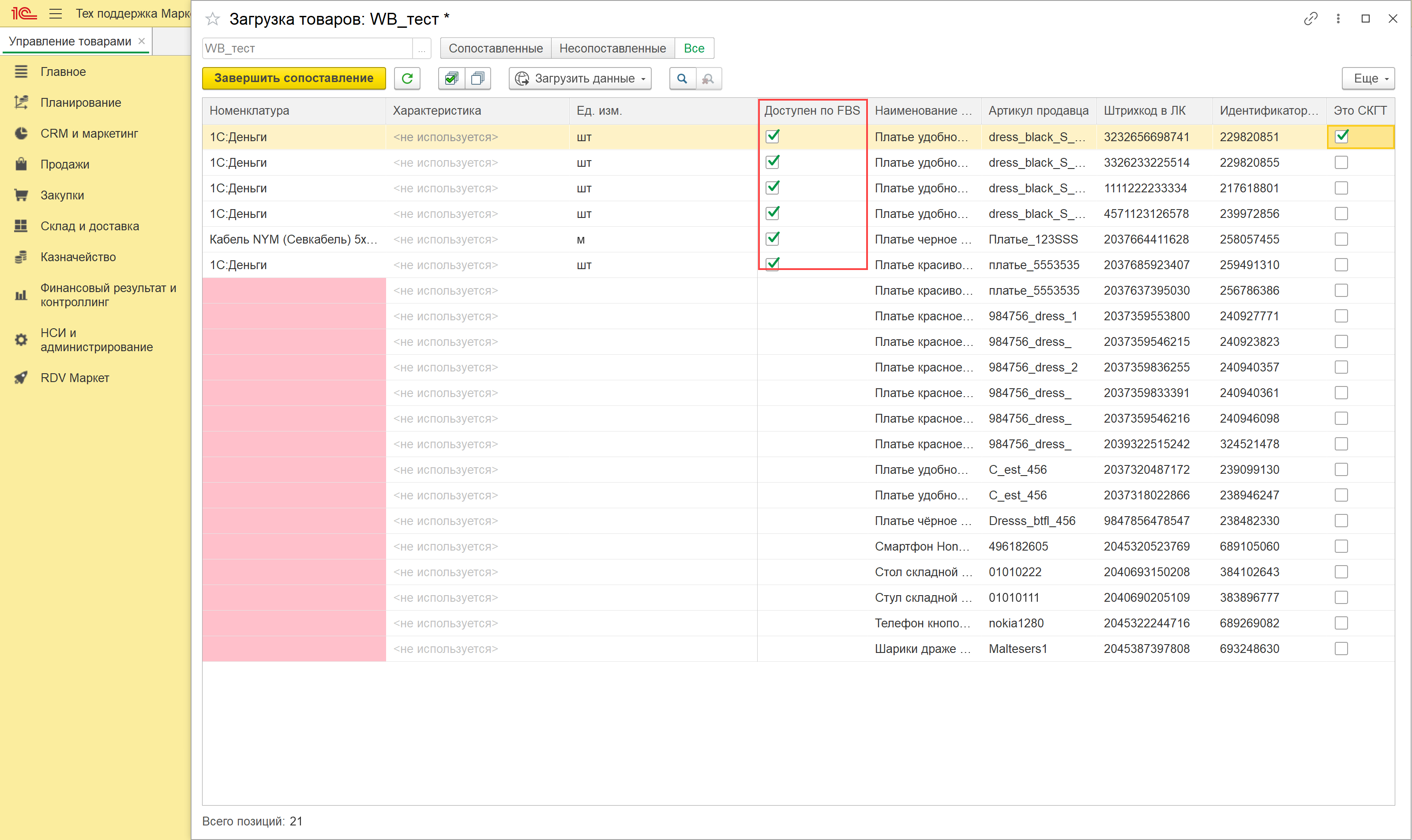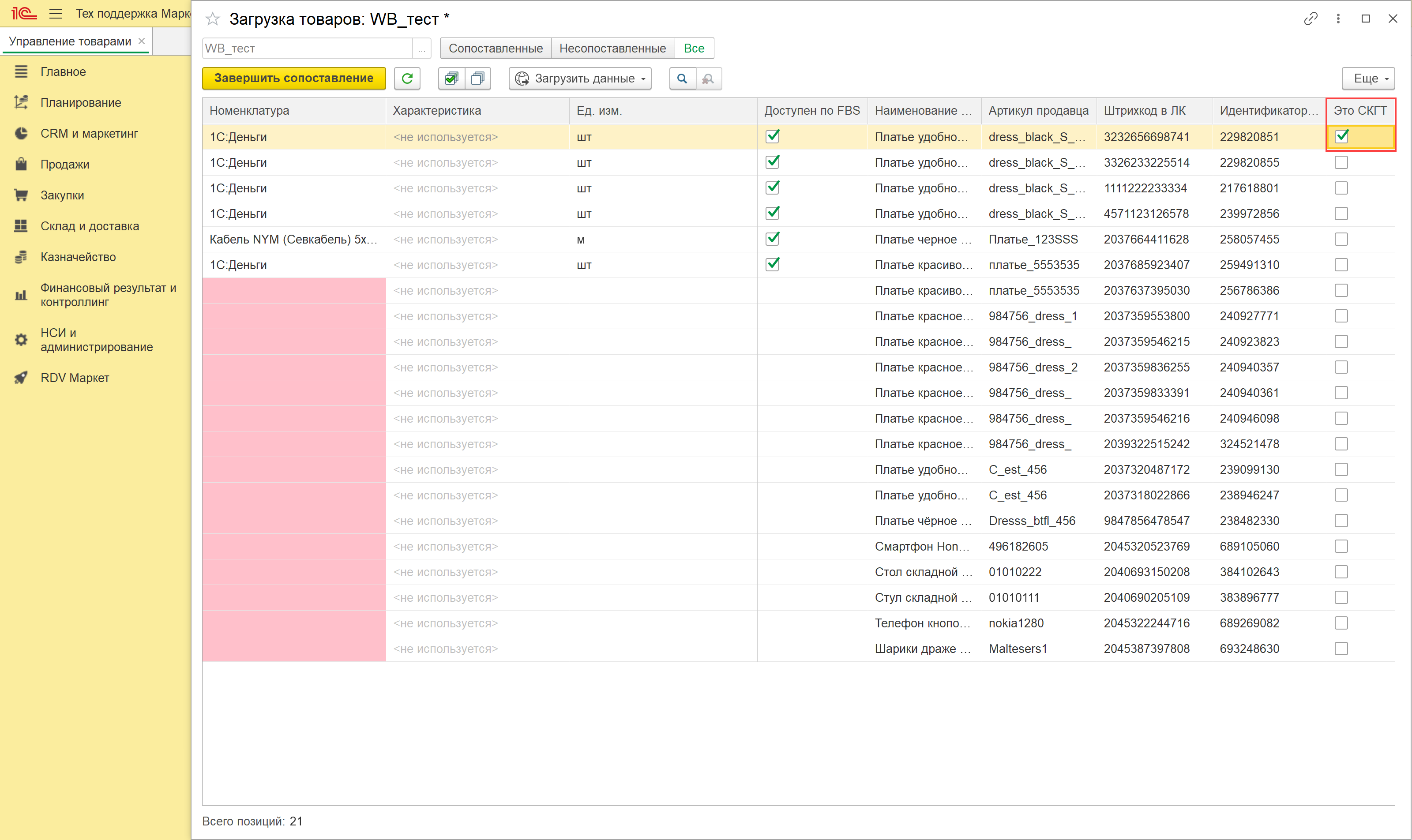 По итогам загрузки по API или из файла открывается новое окно, в котором происходит сопоставление товаров маркетплейса и номенклатуры в 1С.