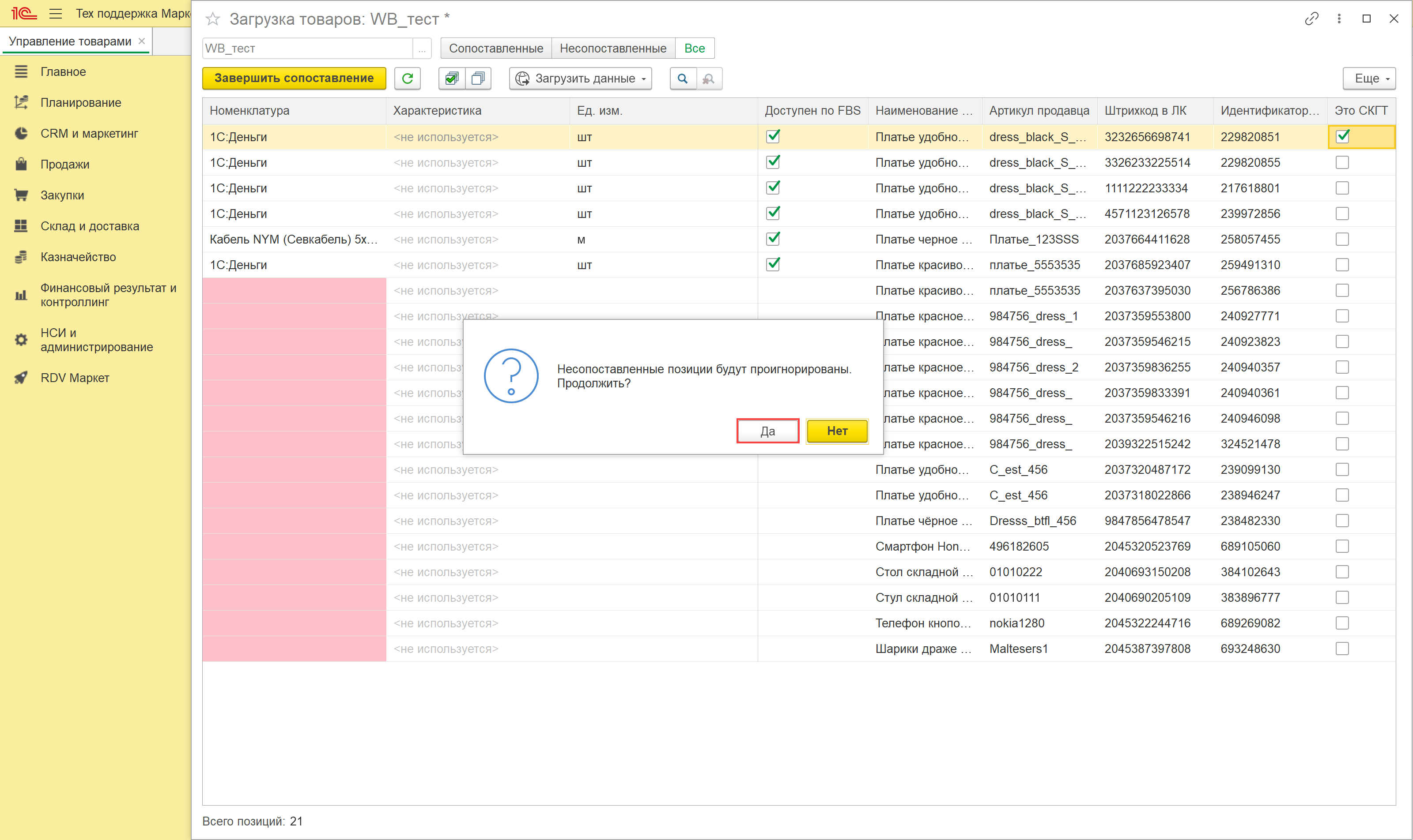 Если остались несопоставленные товары, то появятся соответствующее предупреждение. Нажатие "Да" завершит работу с товарами, а "Нет" - вернет окно загрузки товаров в работу: