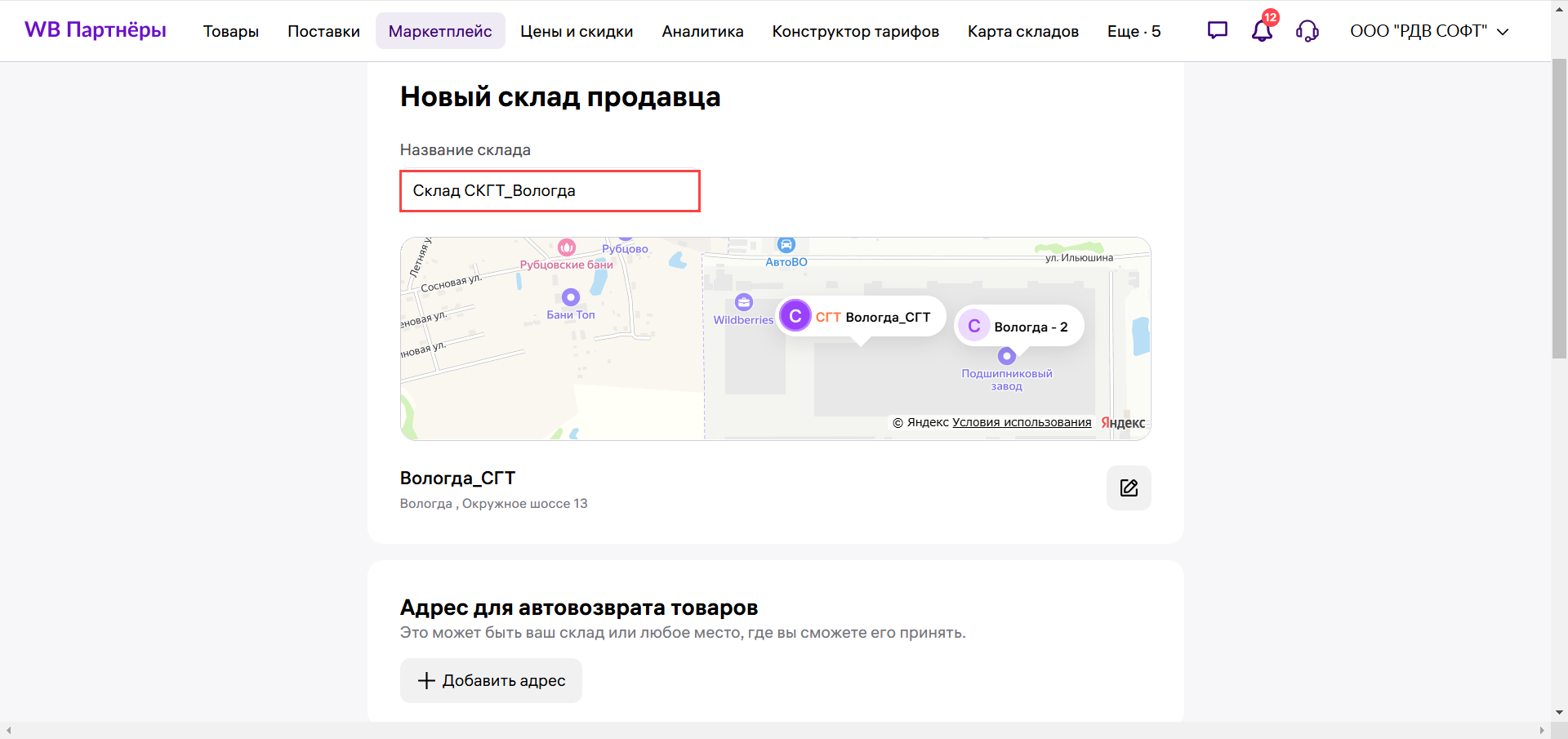 3. Заполните всю необходимую информацию и нажмите кнопку "Создать склад":