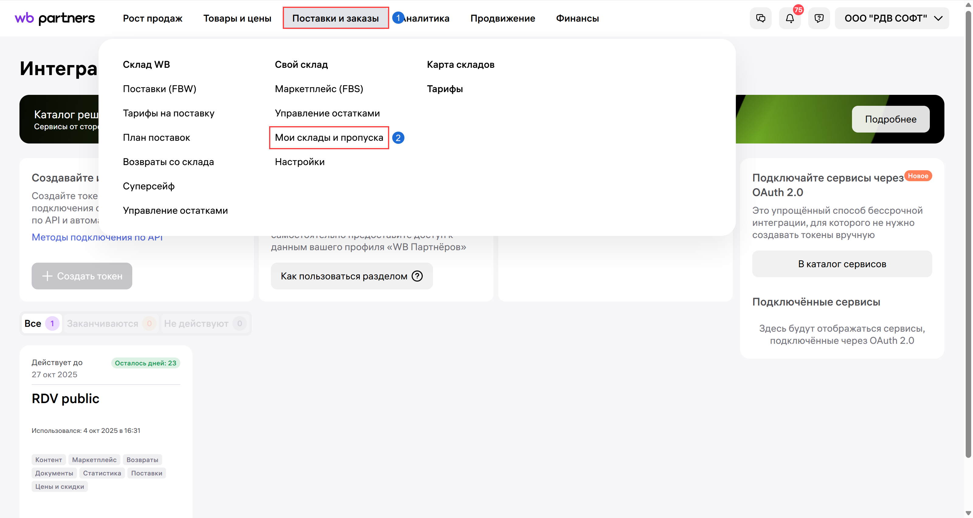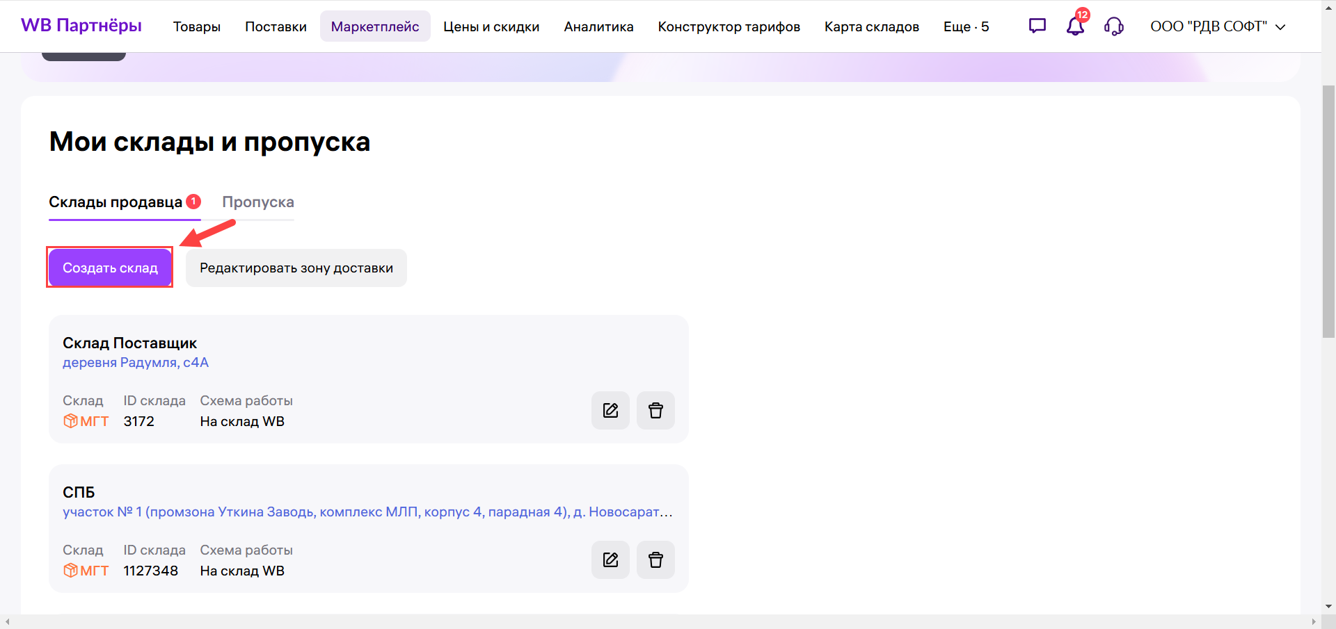 1. Перейдите в ЛК Wildberries в раздел "Поставки и заказы" - "Мои склады и пропуска" - "Склад продавца" - "Создать склад":