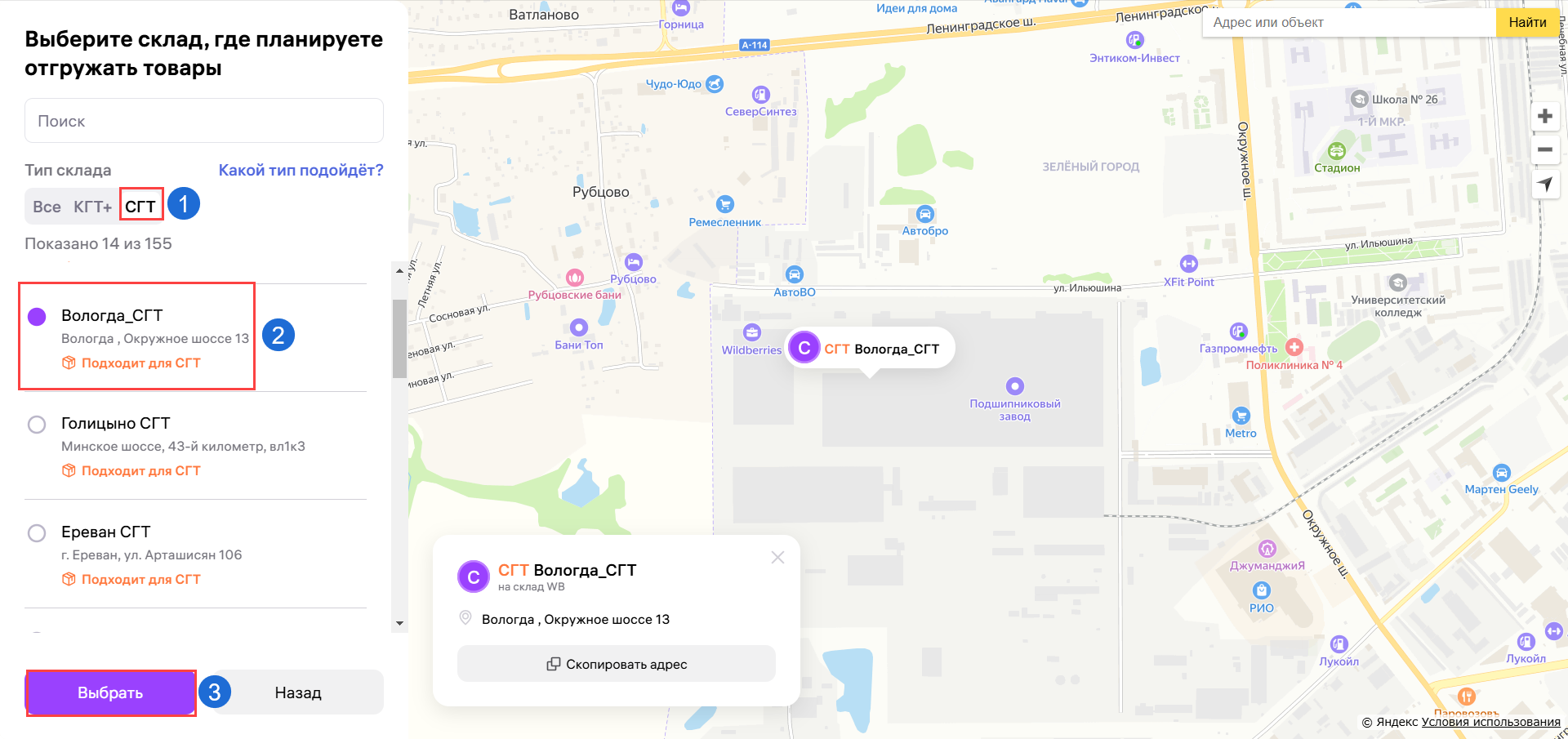 2. Выберите склад, который подходит для СКГТ товаров, из перечня: