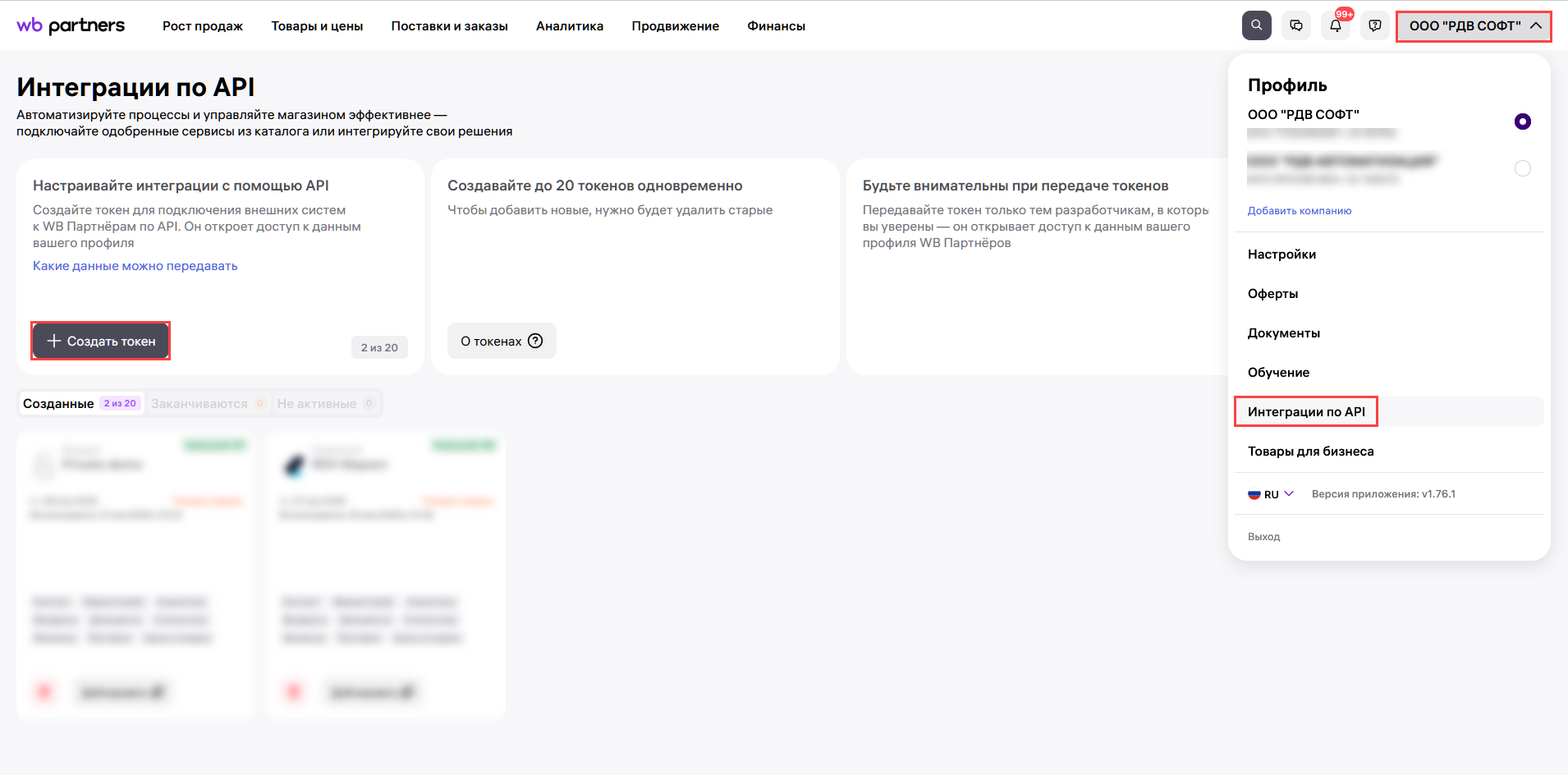 Для этого в ЛК перейдите в раздел "Интеграции по API" и нажмите "Создать токен".