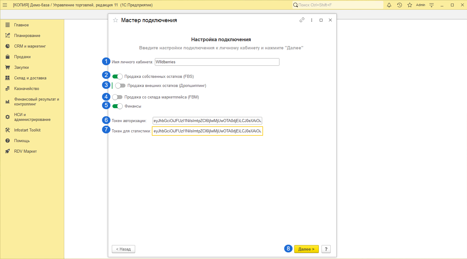 На данном шаге необходимо выбрать разделы обмена данными с маркетплейсом: