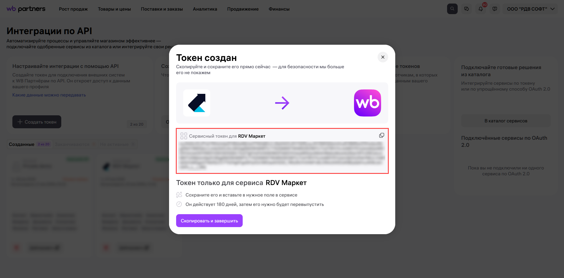 Скопируйте и сохраните созданный токен: