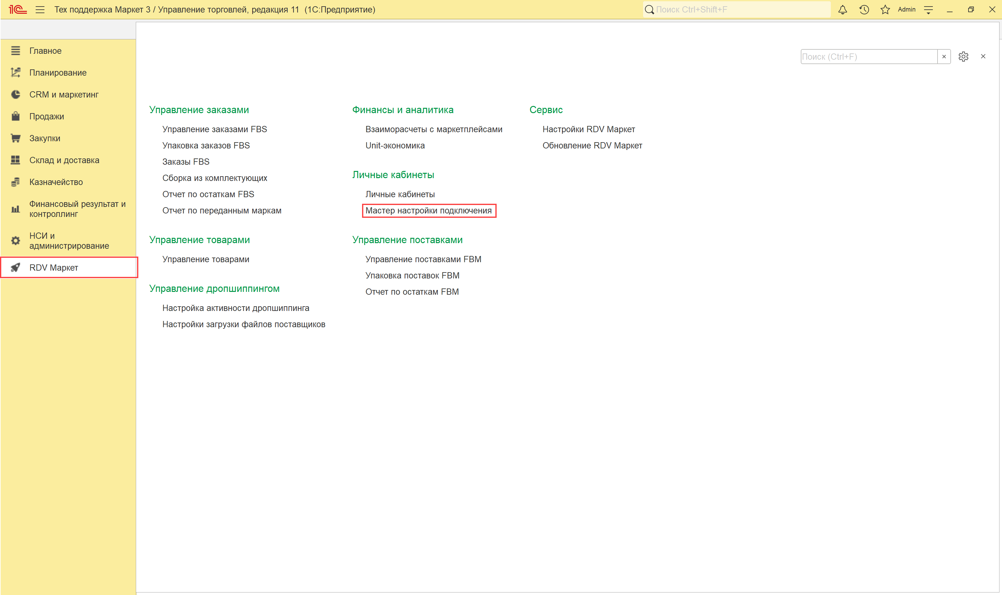 Для настройки личного кабинета необходимо перейти в раздел "RDV Маркет" - "Мастер настройки подключения".