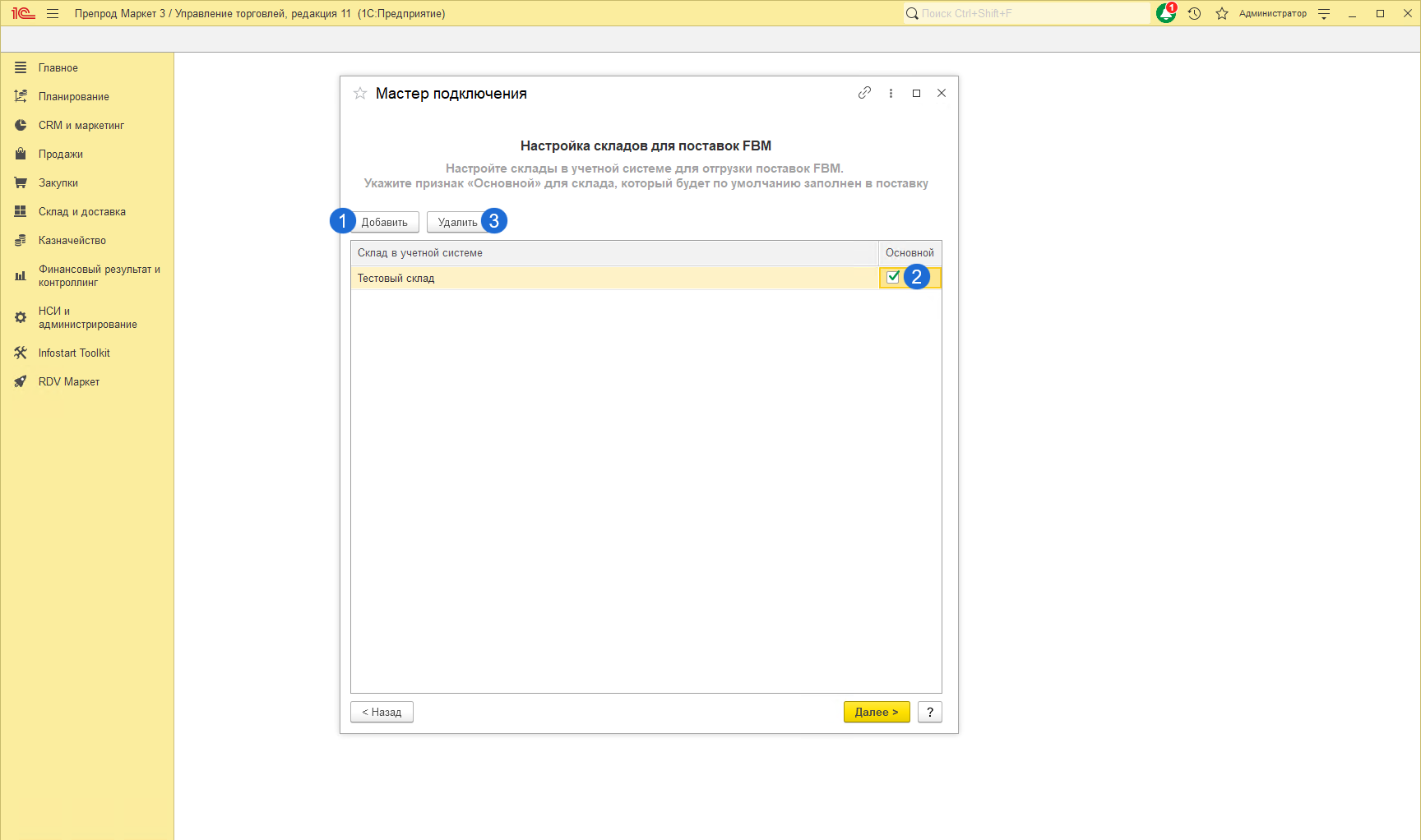 Если ранее была выбрана схема работы FBM, то необходимо добавить(1) склады, которые будут использоваться для работы с поставками FBM.